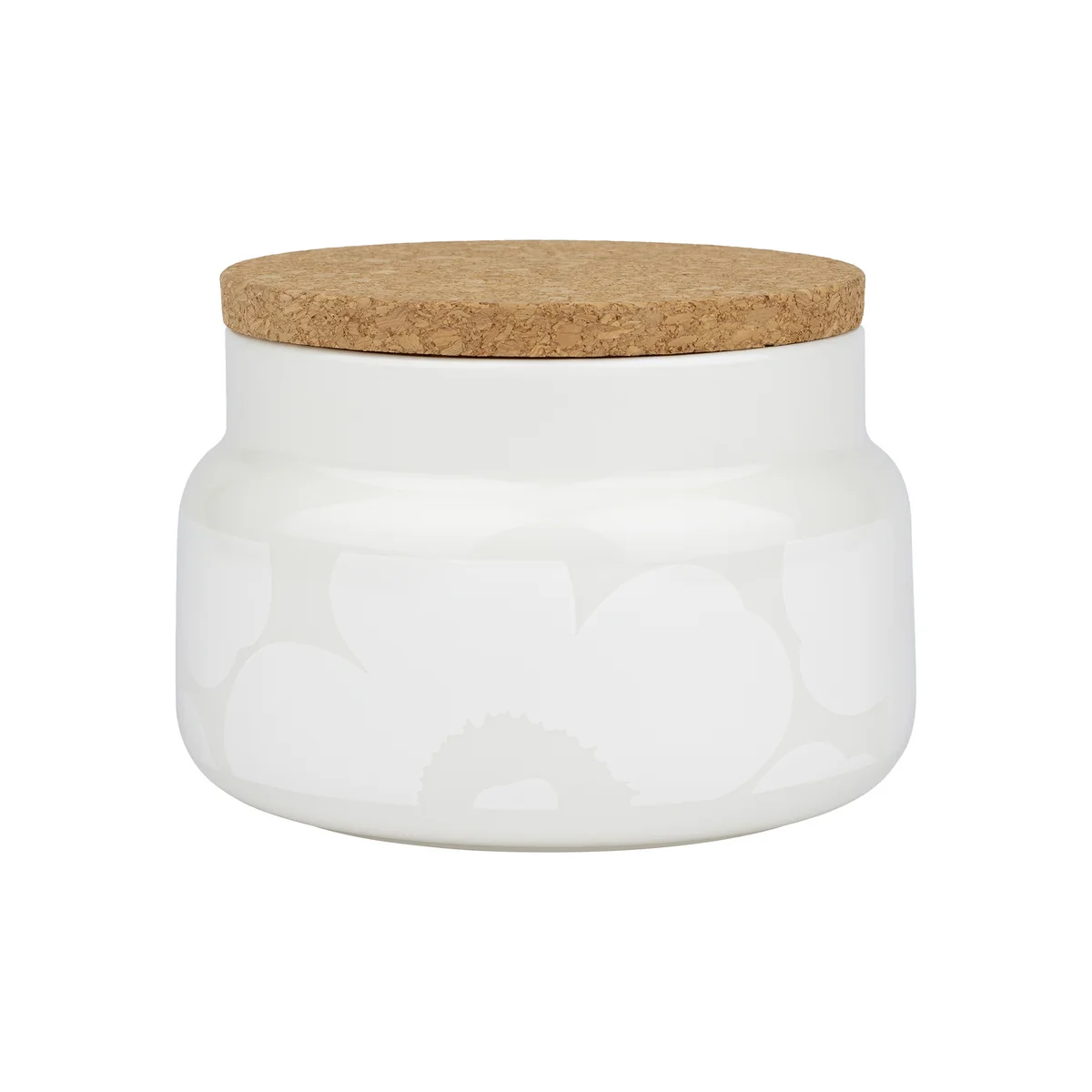 Die Oiva Unikko Aufbewahrungsdose aus dem finnischen Hause Marimekko besticht mit ihrem floralen Muster und den edlen Details. Die Dose mit einem Fassungsvermögen von 700 oder 1200 ml wird aus weißem Steingut mit goldenen Metallpigmenten gefertigt. Die Dose ist mit einem Korkdeckel versehen, der auf der Innenseite mit dem Marimekko-Logo verziert ist.