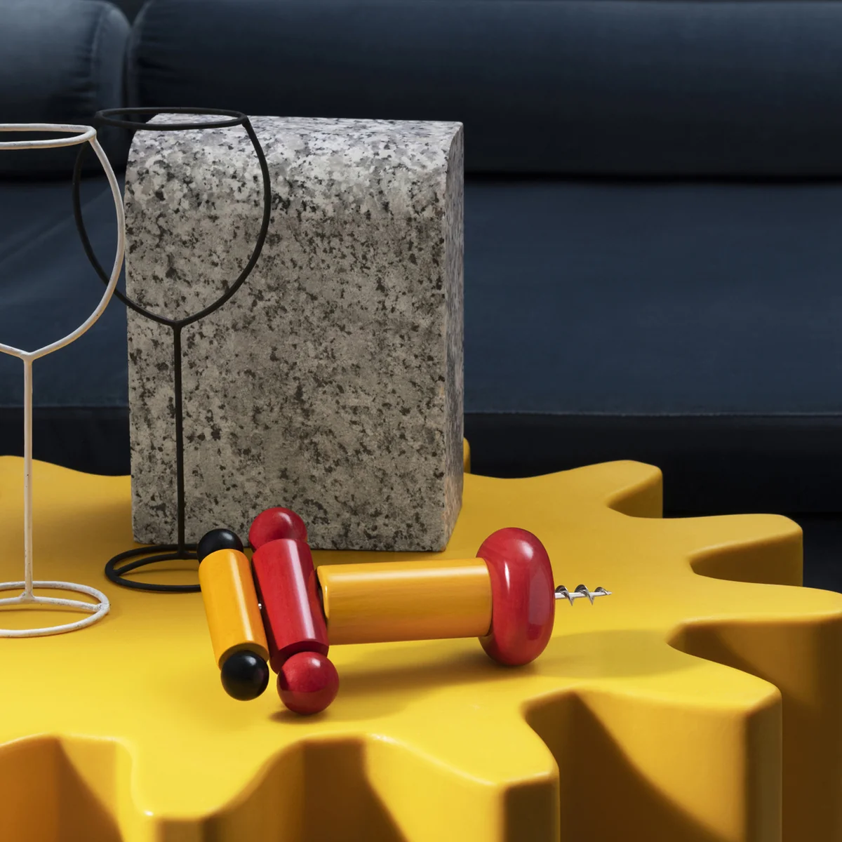 Charakteristisch für die außergewöhnlichen Designs von Ettore Sottsass, zeigt sich der Twergi Korkenzieher in fröhlichen Farben und verschiedenen miteinander kombinierten Elementen. Die organischen Formen vereinen sich zu einem ergonomischen Design, das angenehm in der Hand liegt. Durch sein farbenfrohes Äußeres wird der hölzerne Korkenzieher auch nach der Anwendung zum spielerischen Accessoire auf dem Tisch.