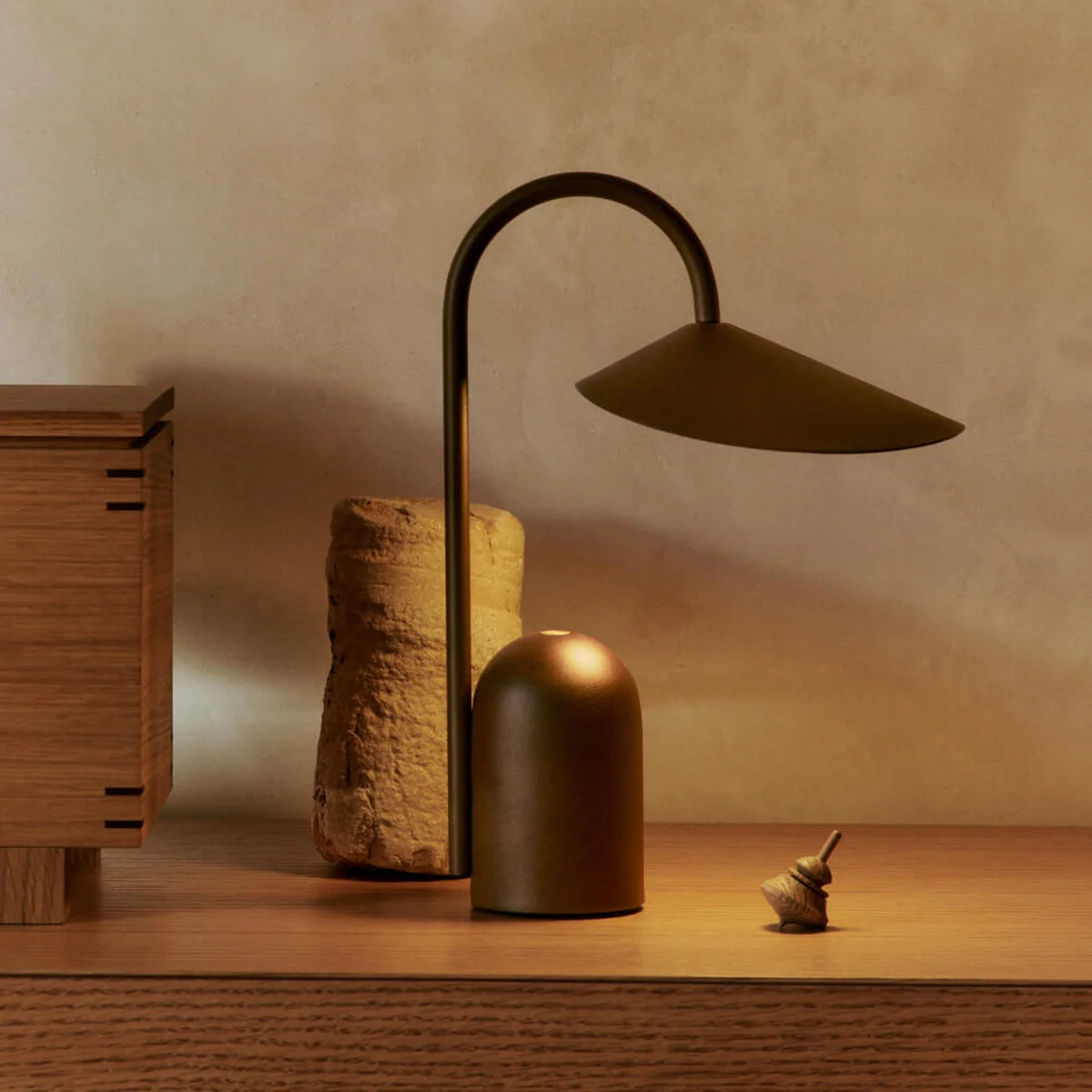 Die Arum Akku LED-Tischleuchte aus dem Hause Ferm Living zeichnet sich durch ihren massiven Marmorsockel aus, der mit einem organisch geformten Lampenschirm kombiniert ist. Der Marmorsockel, der ein harmonisches Gleichgewicht in seinem außermittigen Design schafft, gleicht die anmutige Aufhängung des Lampenschirms an einem gebogenen Metallbogen aus, der an ein Blatt erinnert. Das matte Innere der Leuchte spendet ein sanftes, gleichmäßiges Licht, und der verstellbare Lampenschirm sorgt für eine optimale Beleuchtung in jeder Umgebung.