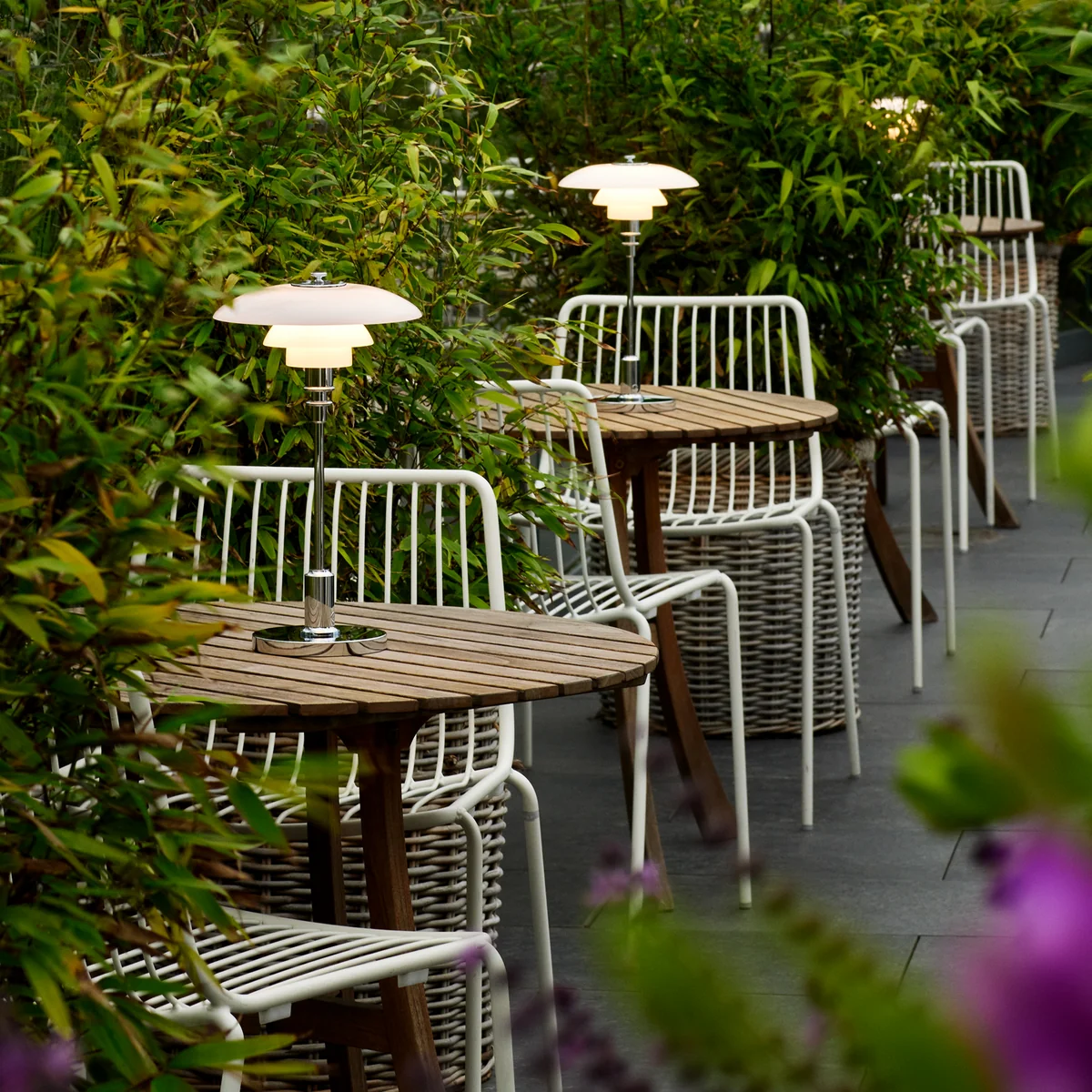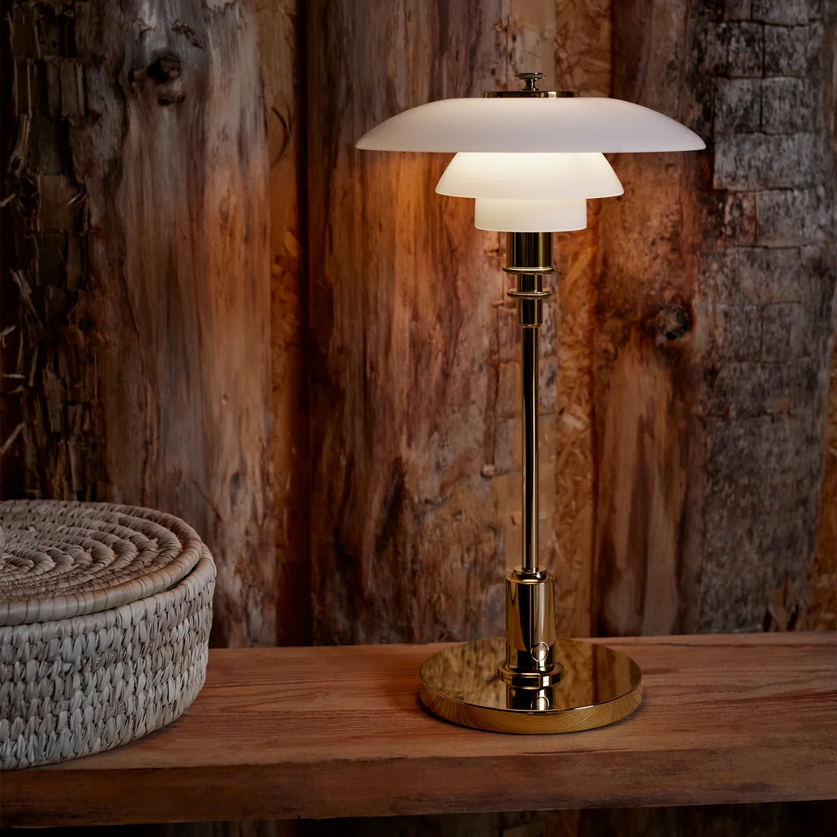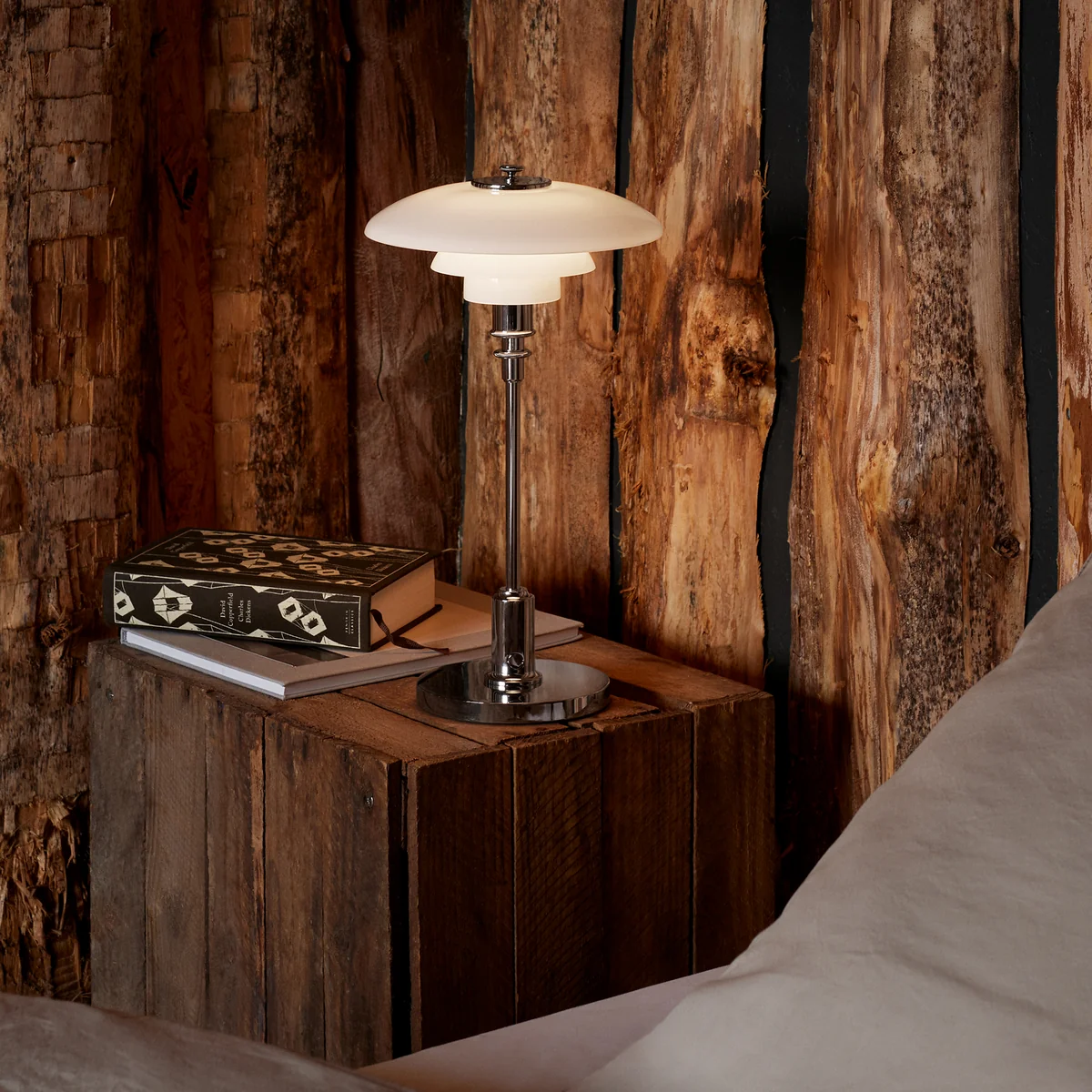 Die PH 2/1 Portable Akku LED-Tischleuchte von Poul Henningsen für Louis Poulsen wurde konzipiert, basierend auf dem Prinzip eines reflektierenden Dreischirmsystems, das eine überwiegende Lichtabstrahlung nach unten gewährleistet. Die Schirme bestehen aus mundgeblasenem Opalglas in drei Schichten, wobei die äußere Schicht glänzend und die innere Schicht matt sandgestrahlt ist. Dies führt zu einer sanften und gleichmäßigen Lichtverteilung im Raum.