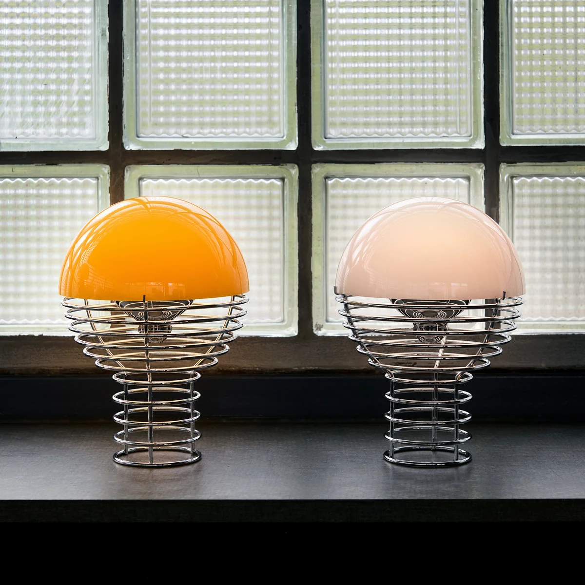 Die Wire LED-Tischleuchte mit Akku von Verpan ist die tragbare Neuinterpretation eines Designklassikers von Verner Panton aus dem Jahr 1972. Charakteristisch sind der offene Drahtrahmen und der kuppelartige Schirm, die der Leuchte ihre unverwechselbare skulpturale Silhouette verleihen. Dank des integrierten Akkus lässt sich die Wire Portable flexibel in jedem Raum einsetzen – ob auf dem Esstisch, im Wohnzimmer oder auf der Terrasse. Mit ihrem weichen, stimmungsvollen Licht und der Mischung aus industriellen Materialien und poetischer Form bringt sie ikonisches Design in den Alltag.
