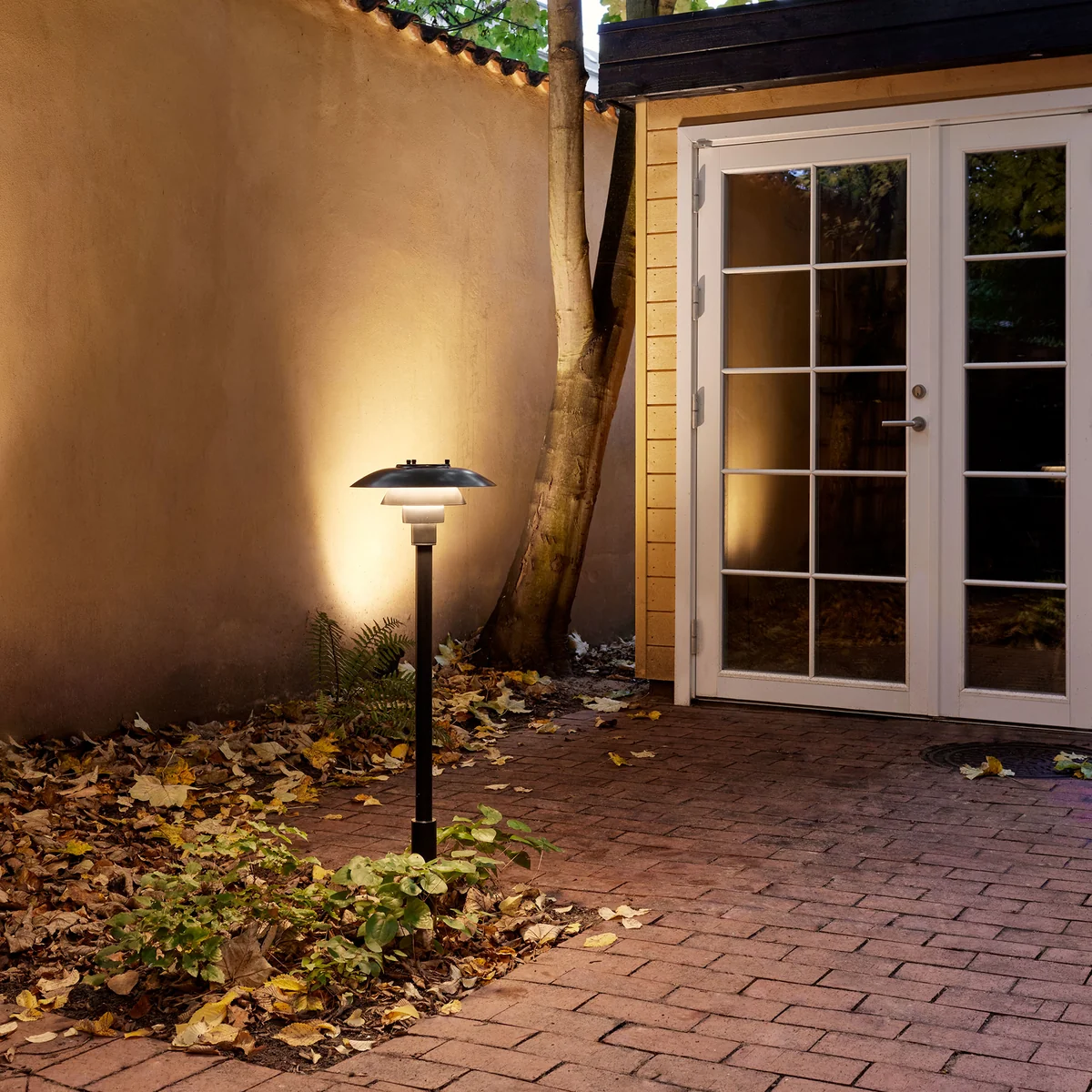 Die PH 3-2½ Pollerleuchte ist Teil dieser innovativen Serie und wurde speziell für den Außenbereich konzipiert. Ihr Design besteht aus drei Schirmsegmenten, wobei das obere einen Durchmesser von 30 cm hat und die darunterliegenden Segmente aus dem Modell 2½ stammen. Diese Konstruktion ermöglicht eine gezielte Lichtlenkung nach unten, während gleichzeitig eine sanfte Lichtverteilung im Außenbereich erzeugt wird.