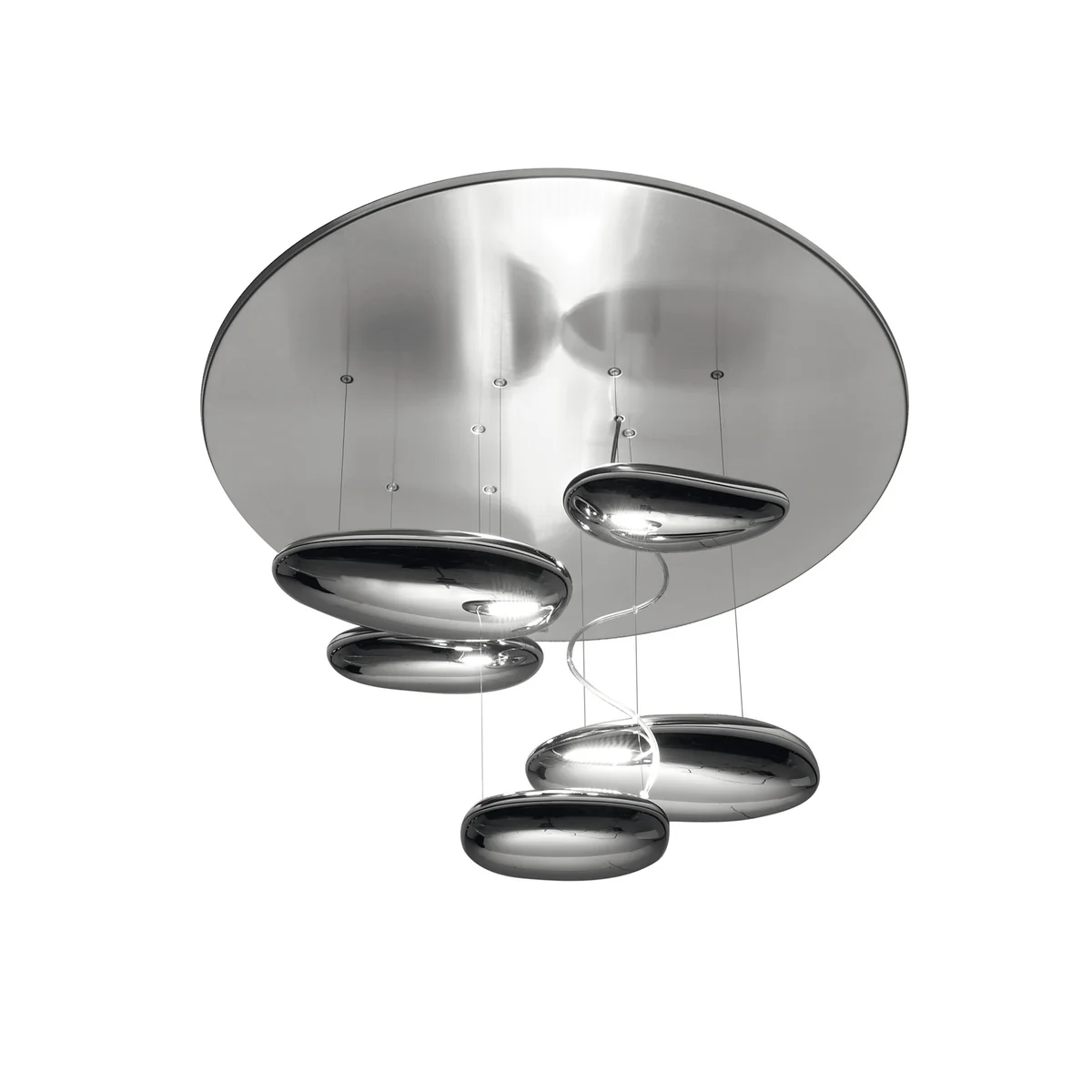 Die Mercury LED-Deckenleuchte von Artemide sticht durch ihr futuristisches Design und die ungewöhnliche Lichtkonstruktion hervor. Wie Tautropfen sehen die glänzenden, hängenden Lichtsteine aus. Die in ihnen versteckten LED-Leuchtmittel werfen ihr warm-weißes Licht an die Edelstahl-Platte an der Decke und sorgen so für eine angenehme Lichtstimmung in jedem Raum. Als optisches Zentrum macht sich die Design-Leuchte nicht nur im privaten Wohnzimmer oder Esszimmer gut, sondern auch in öffentlichen Räumen wie Galerien.