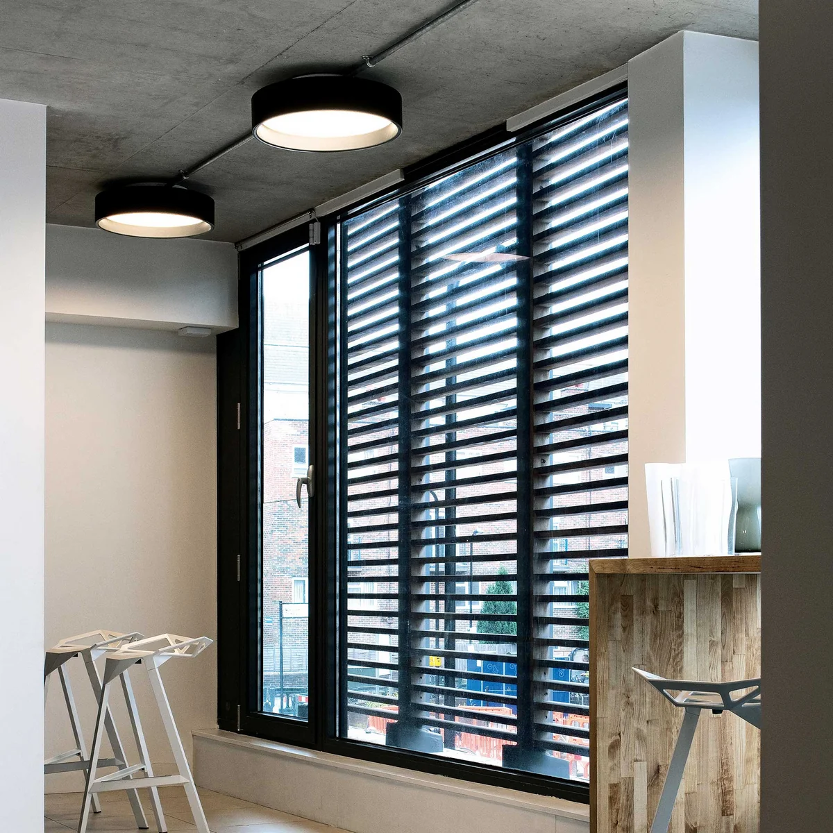 Die Circle Leuchte strahlt diffuses Licht über einen hocheffizienten Acryldiffuser aus. Der Diffuser, der von einem voluminösen farbigen oder weißen Ring umgeben ist, ist verborgen, wenn man ihn aus niedrigen Winkeln betrachtet. Eine Anwinkelung der Ringinnenseite von 5º erzeugt eine angenehme und dekorative Abstufung des Lichts vom Diffuser. Die Leuchte selbst „schwebt“ im Abstand von 34 mm von der Deckenfläche und schafft somit visuelle Leichtigkeit.