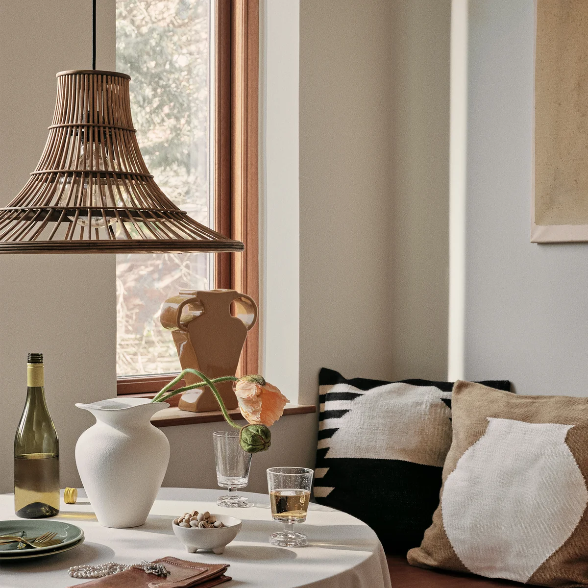 Der Ciba Lampenschirm von Broste Copenhagen, ein atemberaubendes Stück, das natürliche Schönheit mit modernem Design verbindet. Der aus Bambus gefertigte Lampenschirm hat eine warme, naturbraune Oberfläche, die der Einrichtung einen organischen, erdigen Touch verleiht.