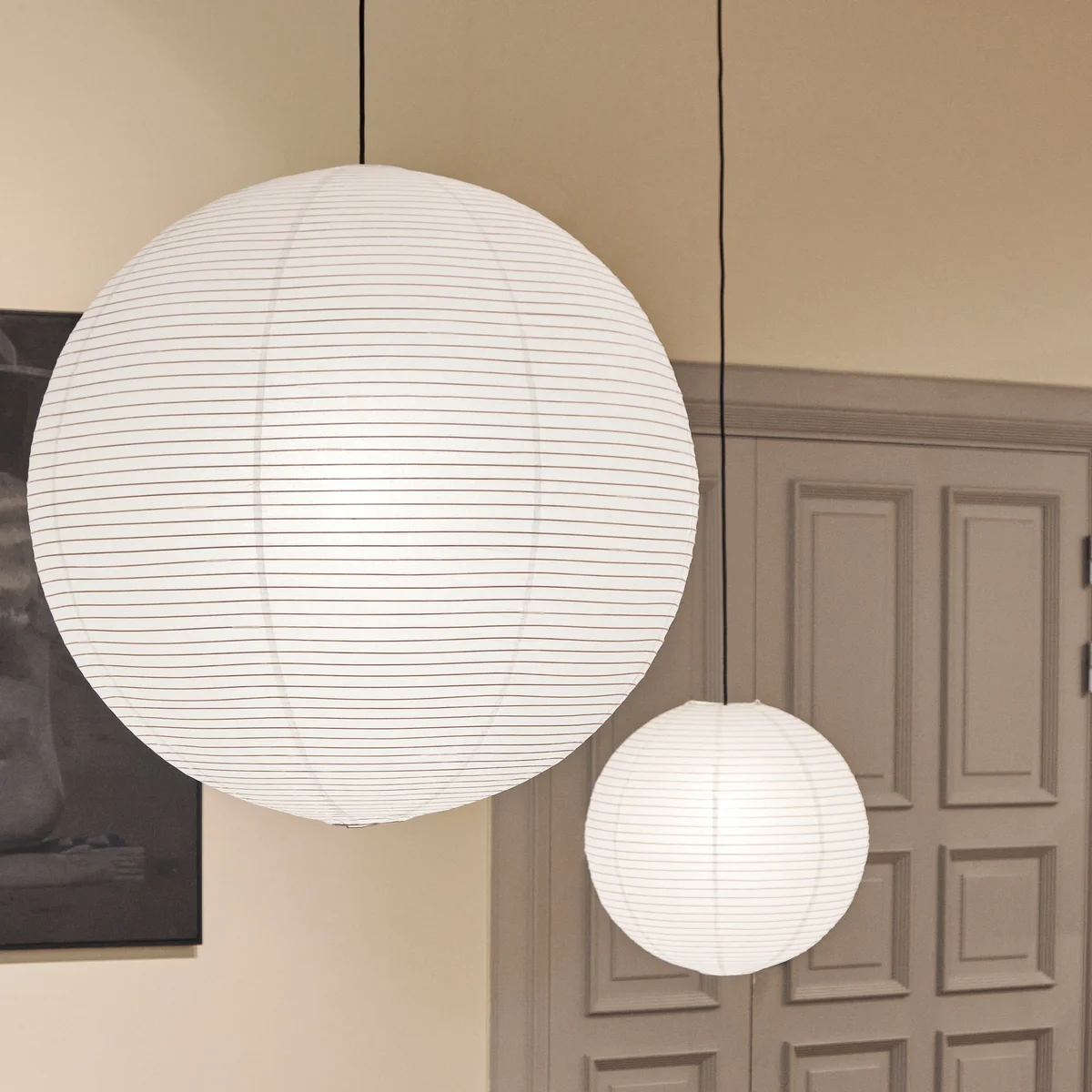Der runde Schirm ist in drei Größen erhältlich und macht sich sowohl im Flur als Decken- oder Pendelleuchte, als auch neben dem Sofa im Wohnzimmer als Stehleuchte hervorragend. Auch als Tischleuchte auf dem Schreibtisch im Kinderzimmer kann der Schirm zum Einsatz kommen. Der Lampenschirm besteht aus dünnem Reispapier, das von einem gerippten Bambusrahmen gehalten wird.