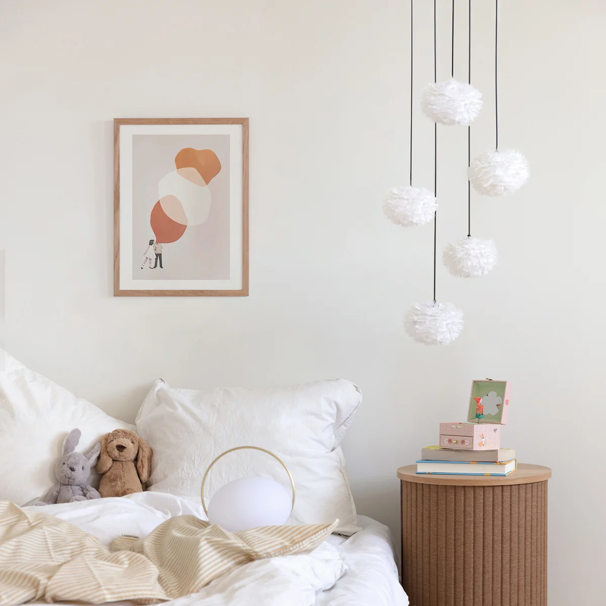 Der weiche Look und die kompakte Größe der Eos Nano machen den Lampenschirm zu einem perfekten Begleiter für verspielte Cluster im Kinderzimmer. Das Aufhängen eines Lichterketten-Mobiles über dem Wickeltisch oder der Wiege wird die Kleinen mit Sicherheit verzaubern.