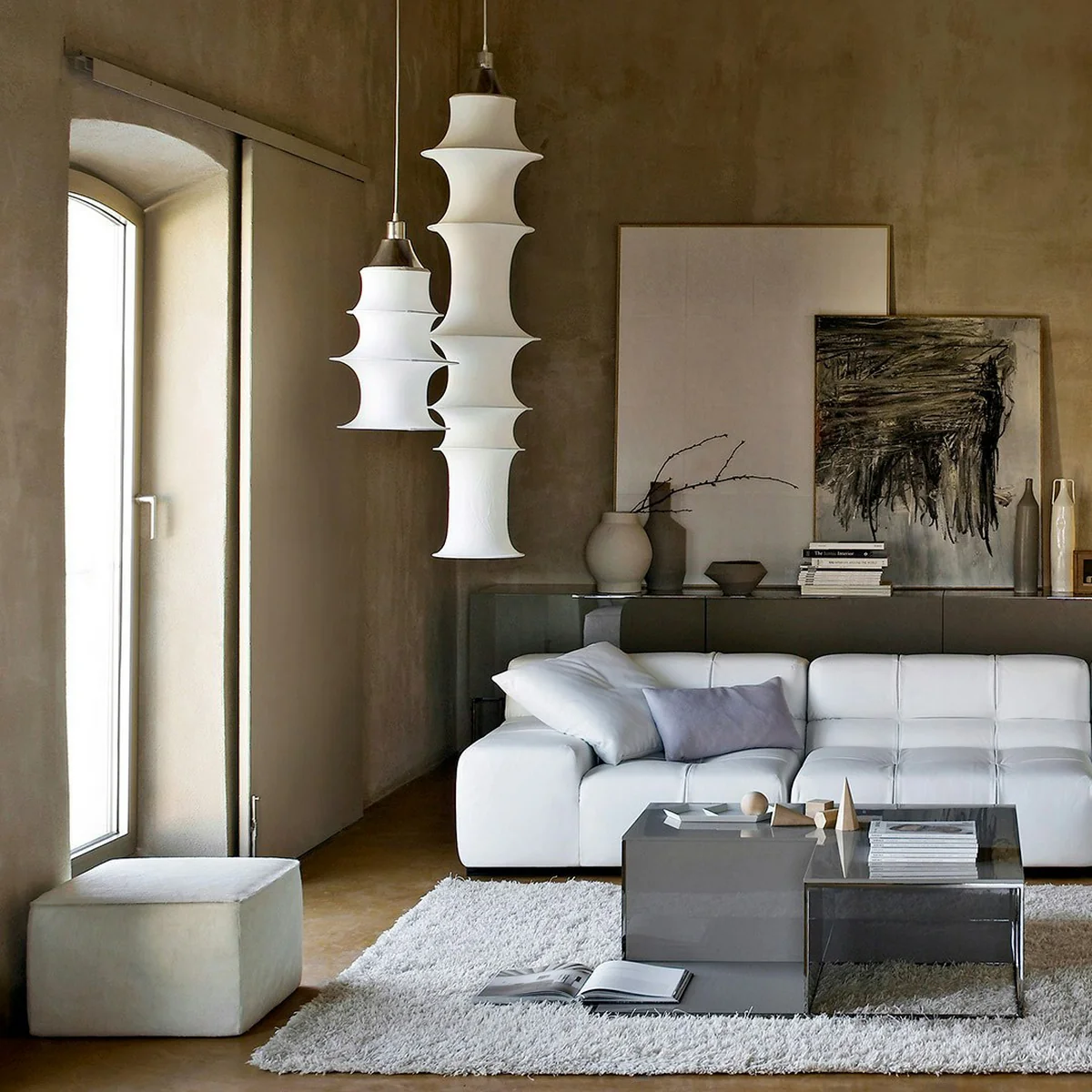 Die Falkland Pendelleuchte, entworfen von Bruno Munari, ist eine ikonische Leuchte, deren Form durch das Wechselspiel von Stoff und Metall entsteht. Der gespannte Gewebeschlauch und die Metallringe erzeugen eine organisch-fließende Silhouette, die im Raum schwebend wirkt.