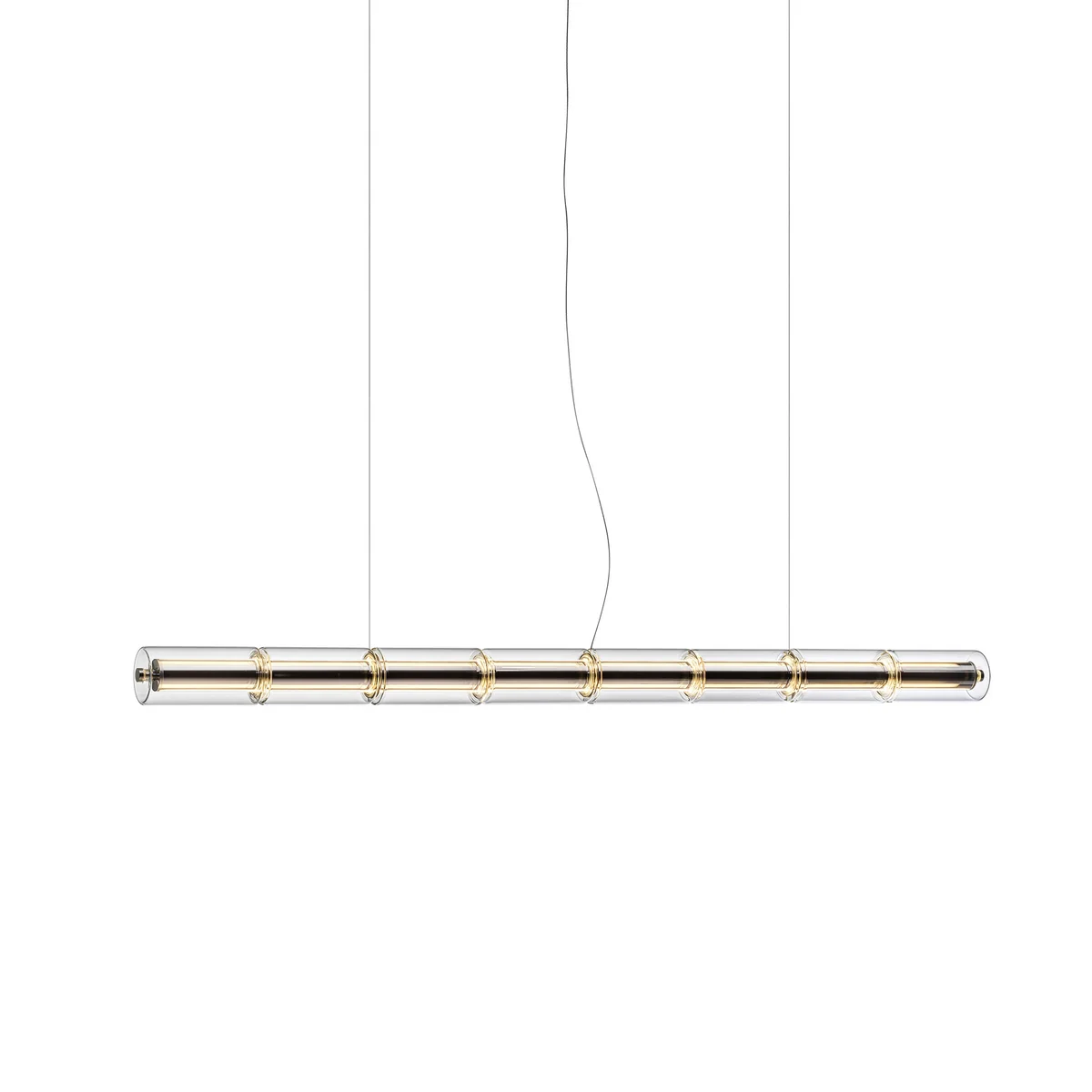 Umschlossen wird das Profil von einer Abfolge zylindrischer Borosilikatgläser, die durch feine Distanzstücke rhythmisch getrennt sind und dem Lichtkörper eine skulpturale Leichtigkeit verleihen. Ob einzeln oder in parallelen Reihen arrangiert – Luce Cilindrica entfaltet in jedem Raum eine ruhige, architektonische Präsenz.