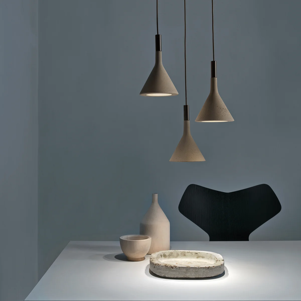 Die Aplomb Mini Pendelleuchte ist die kleine Schwester der Aplomb Leuchte. Auch ihr Schirm ist aus Beton gefertigt und überzeugt durch ein sachliches Design im Industrie-Stil. Die außerordentlich zierliche Eleganz und formale Einfachheit der Leuchte mildert die massive Kompaktheit des Zements und betont sein materielles, gleichzeitig rohes, aber auch edles Aussehen. Die Kombination aus ungewöhnlichem Material und zurückhaltendem Design macht die Leuchte zu einem besonderen Blickfang im Wohn- und Objektbereich.