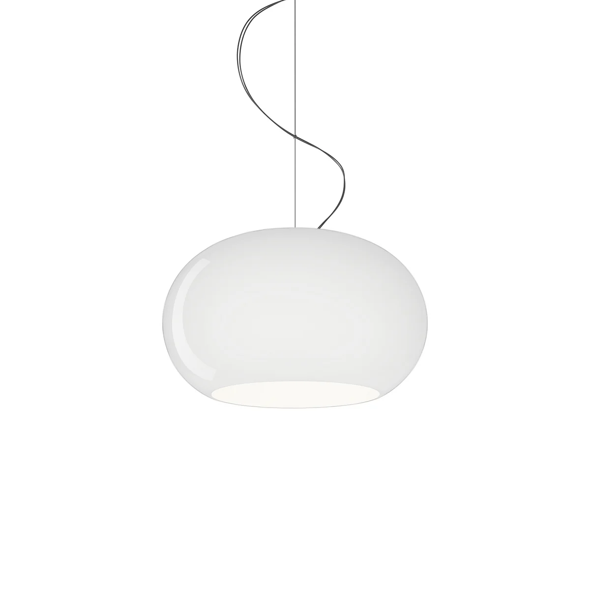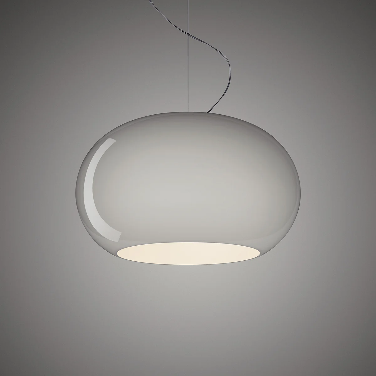 Als Teil der Buds Kollektion präsentiert sich die Buds 2 Pendelleuchte von Foscarini. Der Italiener Rodolfo Dordoni hat mit seinem Design ein Objekt geschaffen, das durch seine weiche und geschmeidige Form begeistert. Die ausladende, bauchige Silhouette des mundgeblasenen Glasdiffusors schafft nicht nur eine klassisch-elegante, sondern durch die Lichtabgabe zudem eine gemütliche Atmosphäre. Der Glaskörper verteilt das Licht semi diffus und erfüllt den Raum dabei mit sanftem Licht. Die Öffnung am unteren Teil der Leuchte hingegen sorgt für eine direkte Beleuchtung der darunter liegenden Fläche.