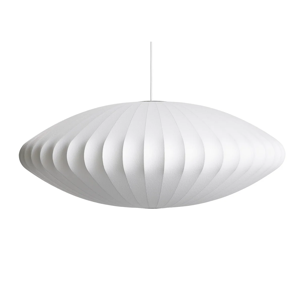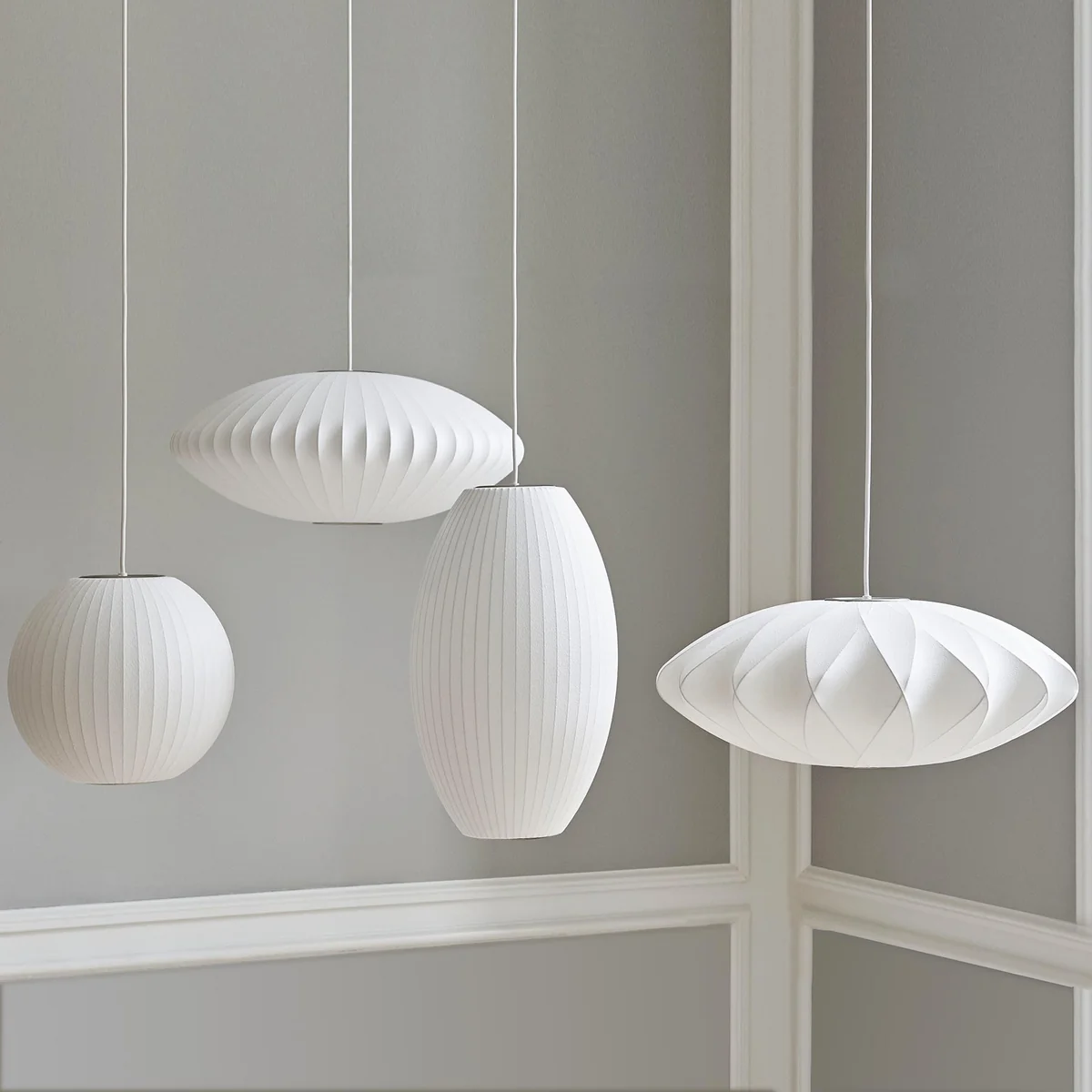 Die Nelson Saucer Bubble Pendelleuchte ist ein ikonisches Designobjekt aus der Mid-Century-Ära. Entworfen 1952 von George Nelson, zählt sie bis heute zu den Klassikern modernen Interior Designs. Mit ihrer sanft organischen Form und dem off-white Schirm aus transluzentem Polymer schafft sie ein warmes, diffuses Licht, das Wohn-, Ess- oder Schlafzimmern eine behagliche Atmosphäre verleiht.