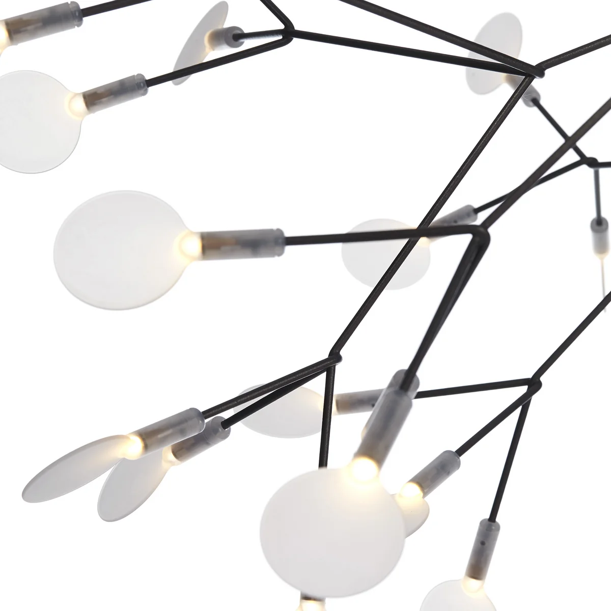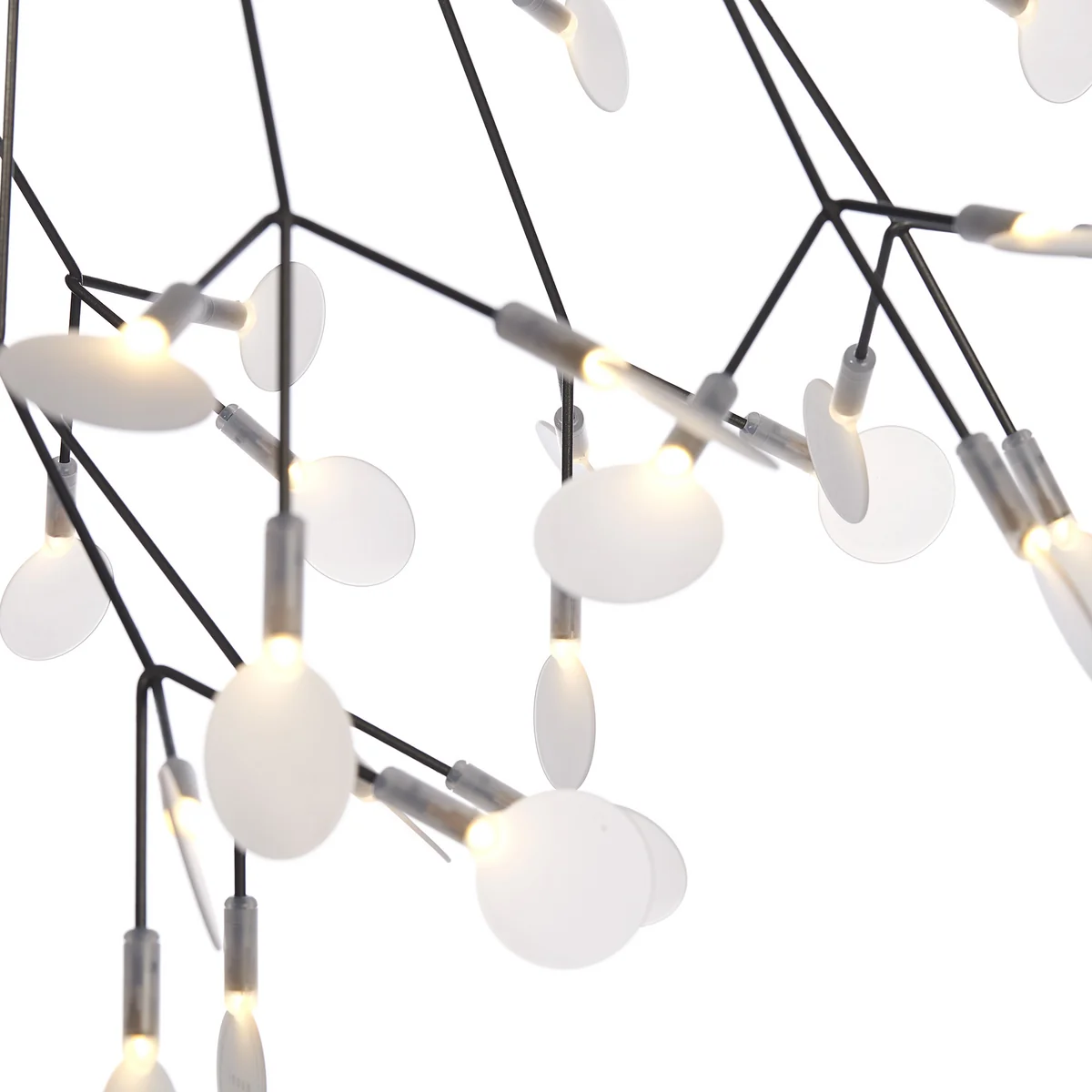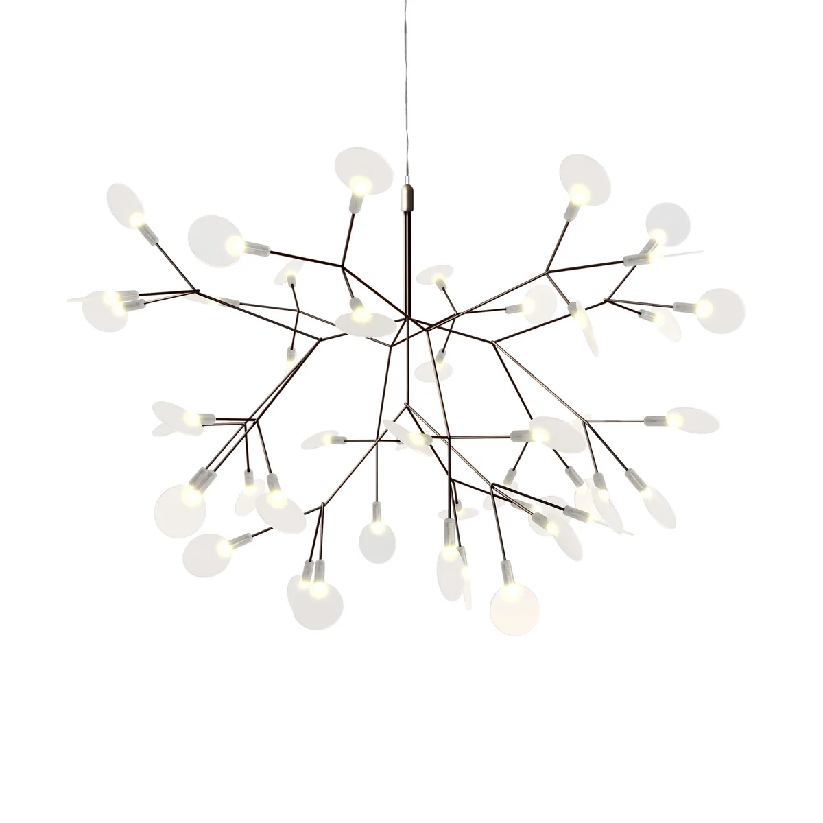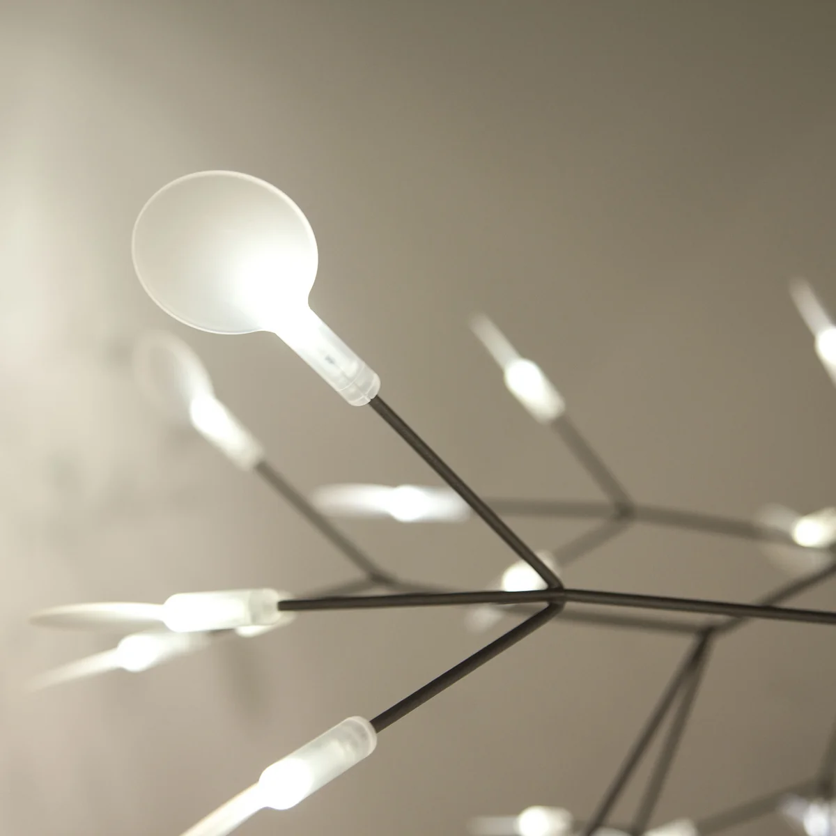 Die Stängel der filigranen Heracleum II Leuchte unterteilen sich von einem Ast aus in dünne Stränge, die eine technische und gleichzeitig organische Leuchte entstehen lassen. Die Stränge enden in einem Blatt, das gleichzeitig Diffuser für das Licht der insgesamt 45 LED-Leuchtmittel ist. Die insgesamt "Blätter" der Leuchte sind zudem beweglich, sodass sich die skulpturale Leuchte bei Bedarf justieren lässt.