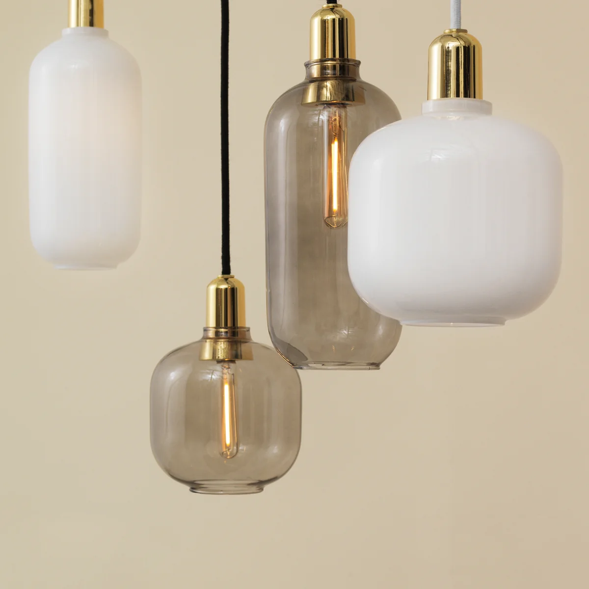 Beide Varianten sind mit einem Lampenschirm in Gold oder Rauchfarben erhältlich. Die Amp Pendelleuchte ist mit einer Fassung in effektvollem schwarzen Marmor oder in glamourösem Jadegrün erhältlich, das die natürliche Eleganz des Materials betont.