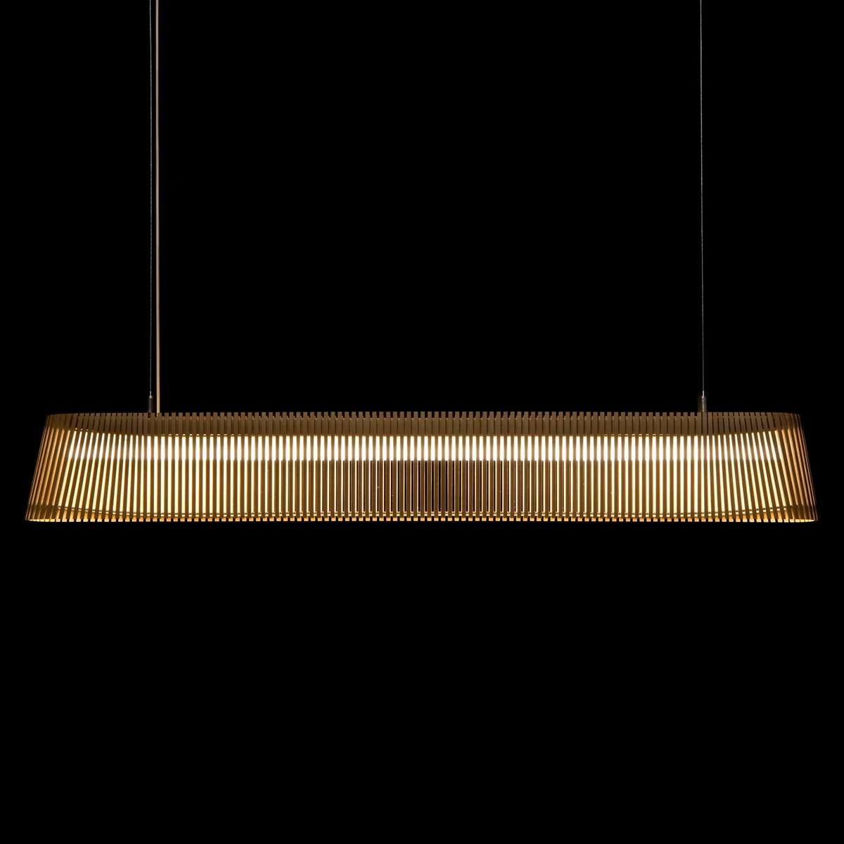 Das schlanke und lang gezogene Design kommt hervorragend über großen Esstischen oder Tresen zur Geltung und sorgt für atmosphärisches Licht im Einklang mit der Natur. Die Leuchte wird über ein Drahtseil an der Decke befestigt und hat insgesamt eine Länge von 100 cm. In Verbindung mit einem externen Phasenabschnittsdimmer sorgt sie stets für das passende Licht.