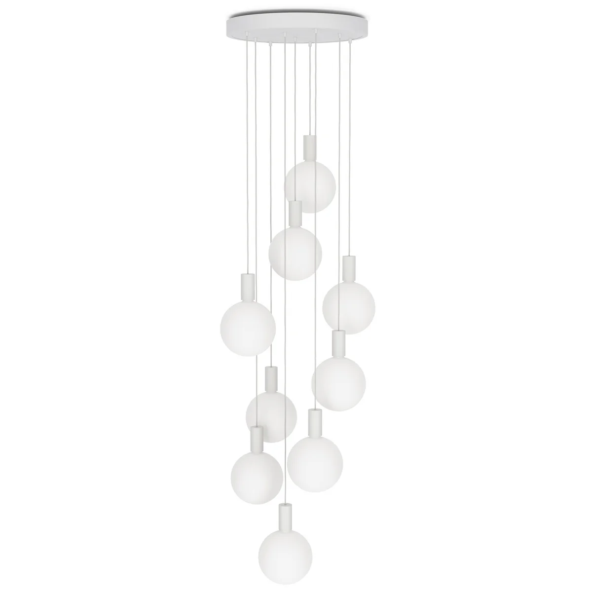 Die Nine Leuchte von Tala kombiniert neun charakteristische Pendelleuchten mit neun markanten, skulpturalen Leuchtmitteln, die alle in einem großen Deckenbaldachin angebracht sind.
