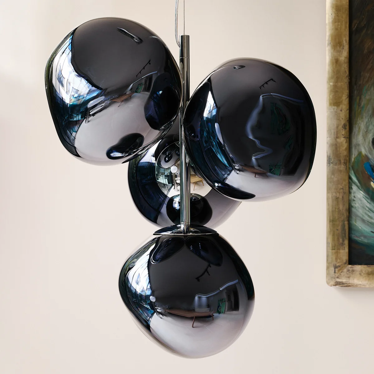 Der Melt Chandelier Mini LED Kronleuchter bringt die faszinierende Ästhetik der ikonischen Melt-Leuchten in einem kompakteren Format – perfekt für moderne Wohnräume und städtische Umgebungen. Mit vier mundgeblasenen Melt Mini Schirmen in einem eleganten, leicht getönten Opal-Finish erzeugt der Kronleuchter ein schimmerndes Lichtspiel, das an natürliche Perlen erinnert. Gefertigt in Deutschland und ausgestattet mit energieeffizienter LED-Technologie, vereint die Leuchte höchste Handwerkskunst mit moderner Lichtqualität. Die Installation erfolgt über einen einzigen Stromanschluss, was Montage und Platzierung besonders einfach macht.