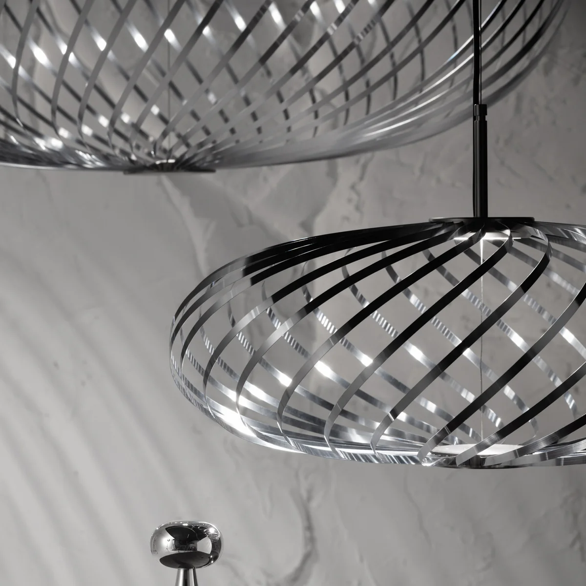 Voluminöse Pendelleuchte aus Edelstahlbändern