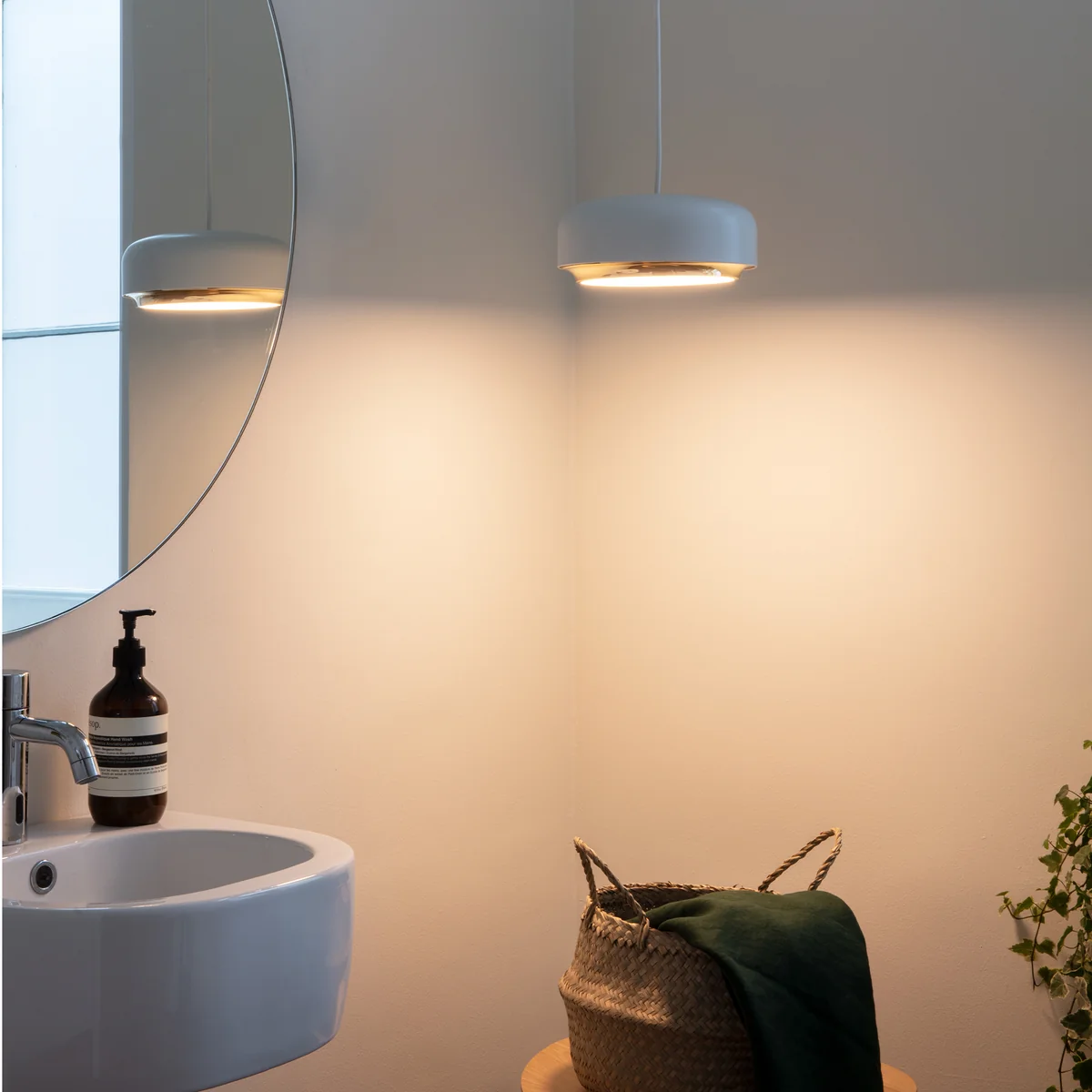 Das eingebaute LED-Panel wird von einem weich-weißen Diffusor abgedeckt, der für ein blendfreies Licht sorgt. Somit eignet sich die Pendelleuchte ideal für den Platz über dem Esstisch oder dem Küchentisch. Erhältlich in verschiedenen Größen.