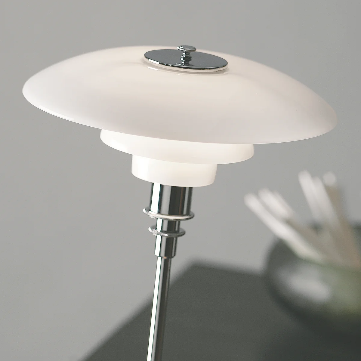 Der Leuchtenschirm wurde ausgehend vom Prinzip eines reflektierenden Dreischirmsystems gestaltet, sodass der größte Teil des Lichtes nach unten geleitet und so blendfrei abgegeben wird. Aus mundgeblasenem, opalisiertem Glas gefertigt und mit einer matten Innenseite versehen, fördert die Leuchte eine diffuse Lichtverteilung. Damit ist die Louis Poulsen Stehleuchte ein willkommener Begleiter im Wohnbereich, wo sie neben dem Sofa oder Sessel für eine wohnliche Atmosphäre sorgt.