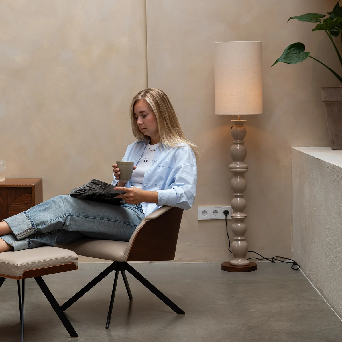 Die Brew Stehleuchte von Zuiver bringt Gemütlichkeit und Stil in perfektem Gleichgewicht zusammen. Inspiriert von aufgestapelten Kaffeetassen, erinnert die keramische Halsform in Farbe und Form an das entspannte Ritual einer frisch gebrühten Latte. In Kombination mit der walnussfarbenen Holzbasis und dem schlichten Leinenlampenschirm entsteht eine warme, einladende Lichtquelle für jede moderne Wohnumgebung.