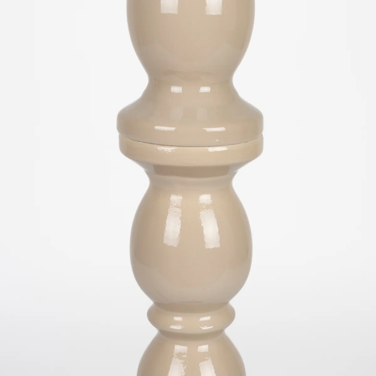 Die glänzende Keramikhals ruht stabil auf einem soliden Fuß aus Walnussholz – eine Kombination, die Wärme und Eleganz ausstrahlt. Der Schirm aus hellem Leinenstoff sorgt für angenehm diffuses Licht, das den Raum mit wohnlicher Atmosphäre erfüllt. Ein besonderes Highlight: Das Licht lässt sich über ein klassisches Zugband aus Eisen an der Innenseite des Schirms ein- und ausschalten – eine charmante Reminiszenz an vergangene Zeiten, die dem Design nostalgischen Charakter verleiht.
