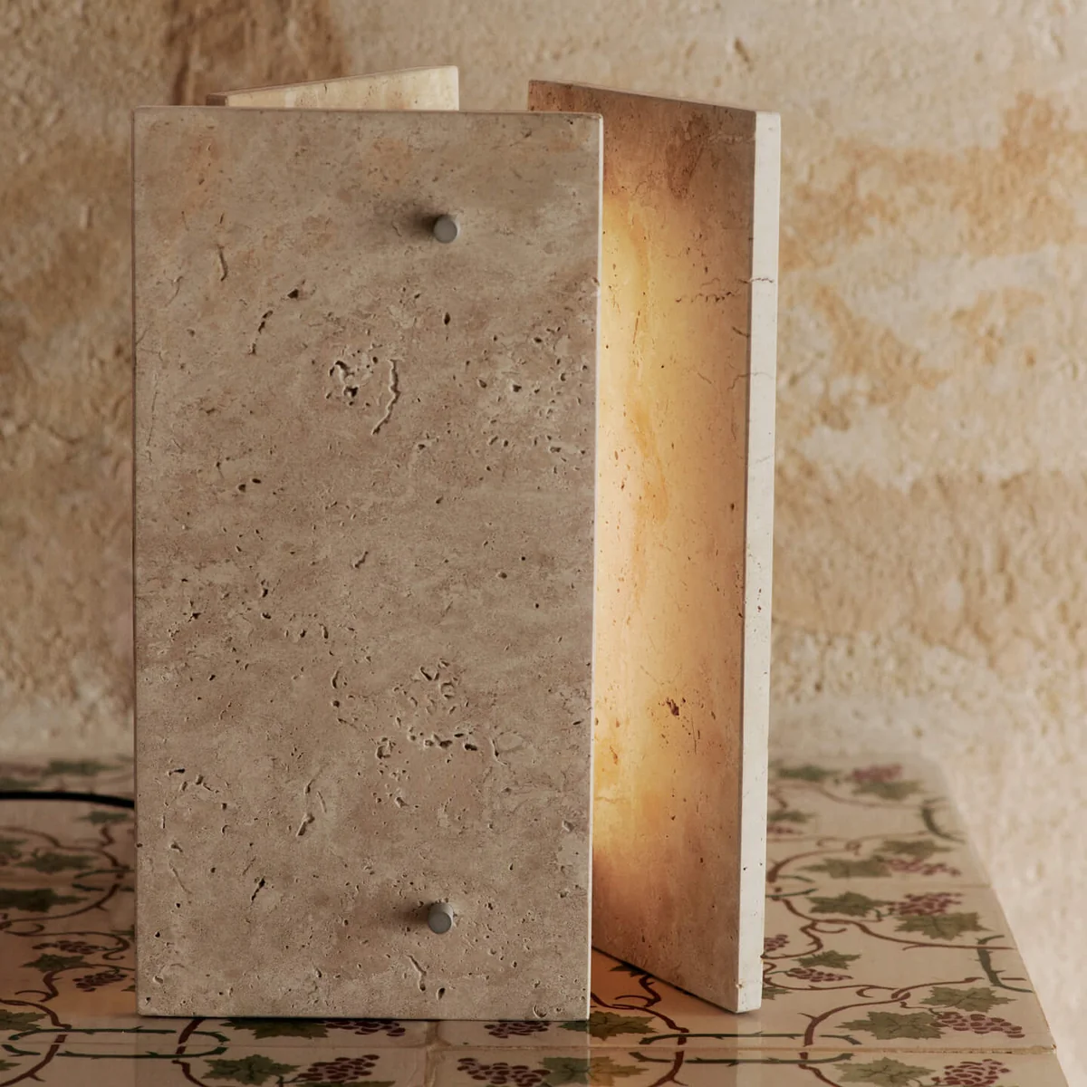 Drei Travertin-Paneele umschließen die zentrale Lichtquelle und erzeugen ein faszinierendes Spiel aus Licht und Schatten. Die natürliche Struktur des Steins verstärkt das warme, diffuse Licht und sorgt für eine sanfte, architektonische Atmosphäre. Die Leuchte wird flach verpackt geliefert, ist leicht zu montieren und verfügt über eine integrierte Dimmfunktion. So verbindet sie Materialität mit Funktionalität und bietet eine stilvolle Lichtlösung für jeden Raum.