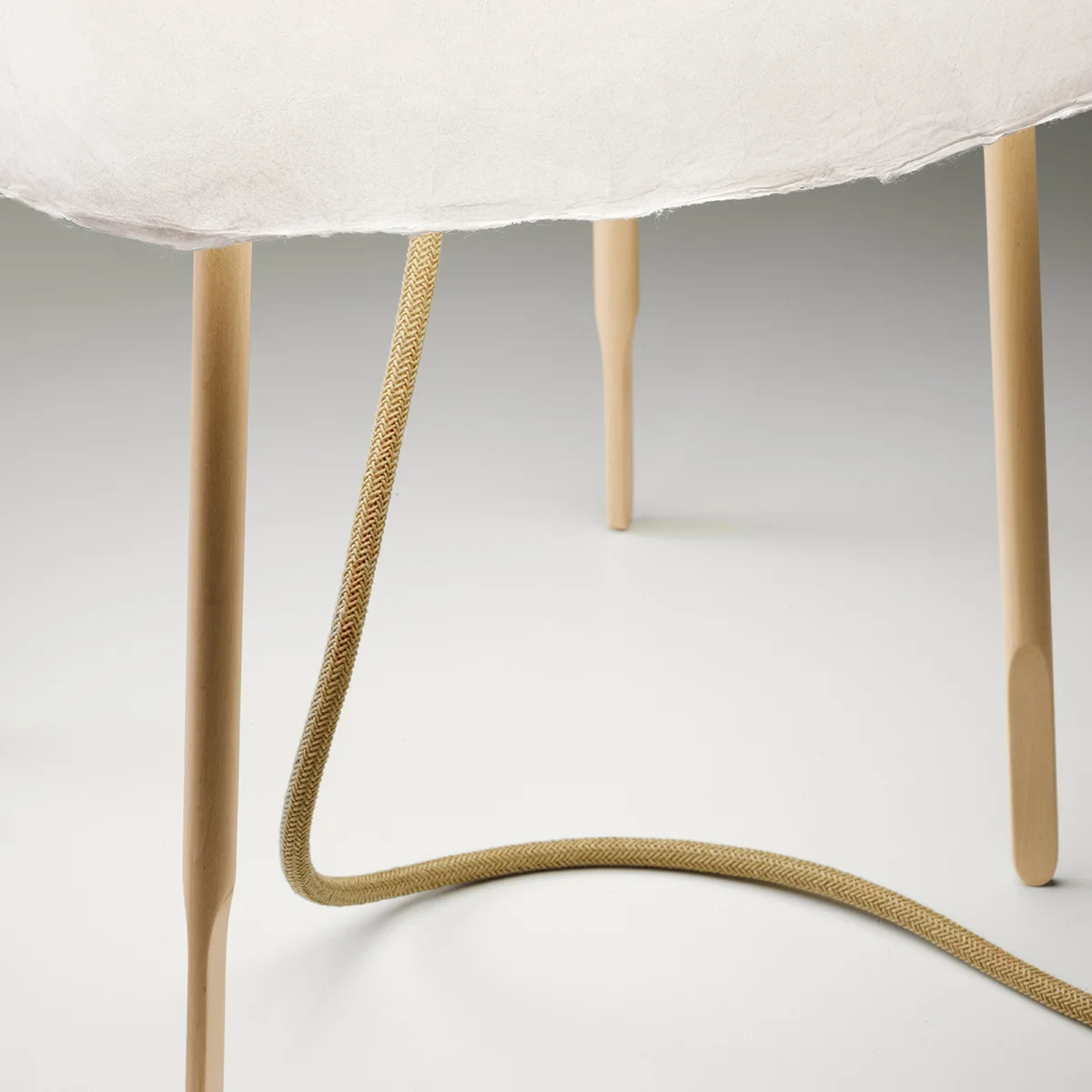 Das Kabel der Leuchte ist mit Papierfasern ummantelt, um zum einen das innenliegende Kabel zu sichern und zum anderen um das grazile Design zu unterstützen. Naturfarbene Escheholzbeine komplettieren die zarte Gesamterscheinung der Leuchte und vermittelt eine elegante Unbeschwertheit mit asiatischem Charme.