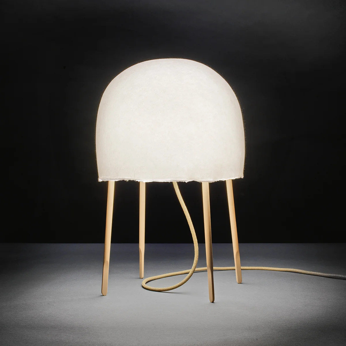 Die Tischleuchte des italienisch-japanischen Designerteams Luca Nichetto und Nendo trägt den Namen Kurage, was dem japanischen Wort für ‚Qualle‘ entspricht. Mit dem zarten, voluminösen Lampenschirm und den vier schmalen Beinen ähnelt die Leuchte tatsächlich dem anmutigen Meerestier und verkörpert ausgezeichnet seine Eleganz.