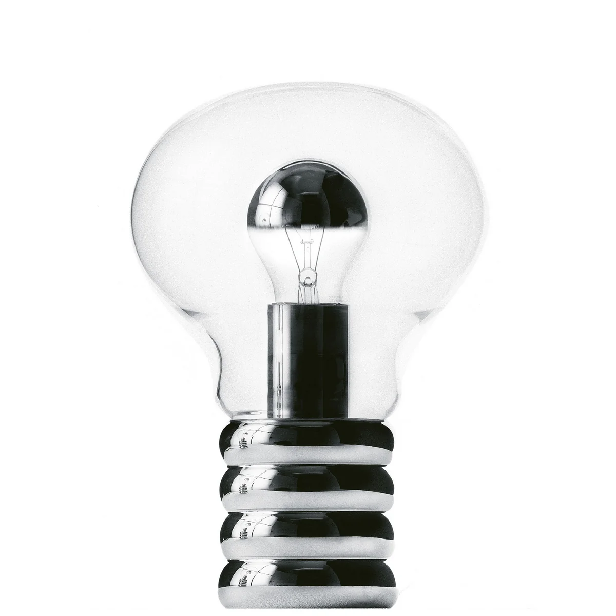 Die Tischleuchte Bulb von Ingo Maurer besteht aus mundgeblasenem Kristallglas mit einem Sockel aus hochglanzverchromtem Metall. In der Lieferung von Bulb ist eine kuppenverspiegelte Glühlampe (E27 230/125Volt max. 100 W) enthalten.