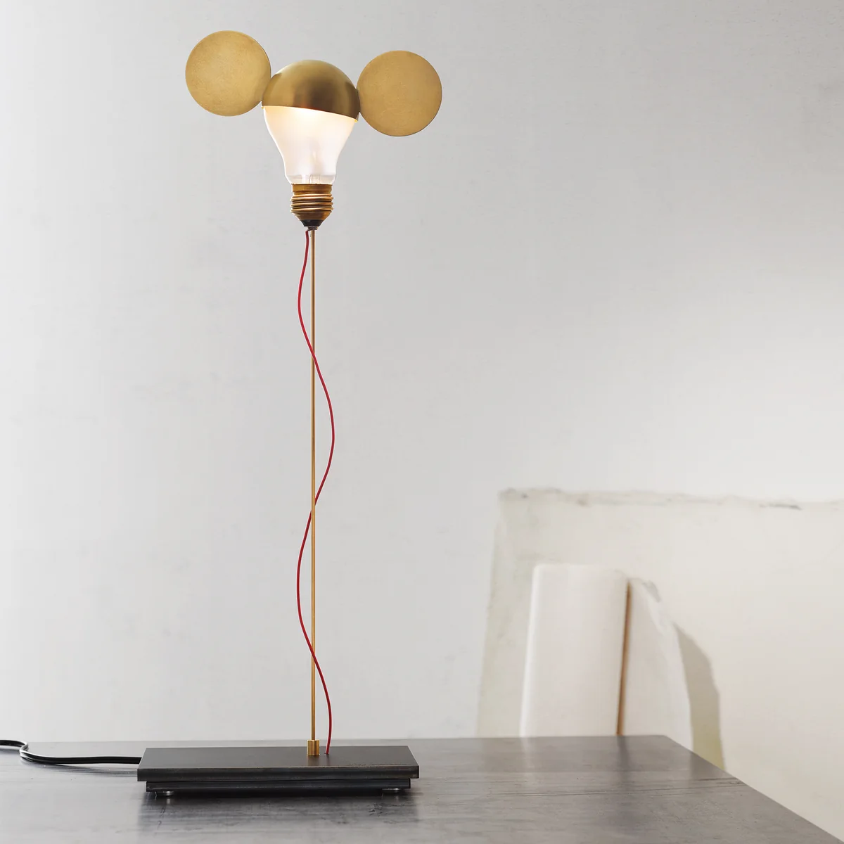 Die Mausohren bestehen aus lackiertem Messing und sind in verschiedenen Farbvarianten erhältlich, während der Standfuß aus Stahl besteht. Das Leuchtmittel ist eine matte Halogen-Glühlampe.