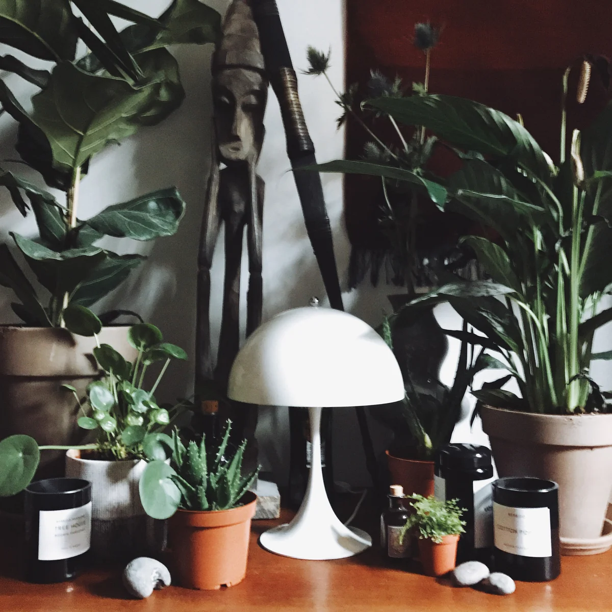 Das organische Design der Panthella Tischleuchte ist an die Form eines Pilzes angelehnt. Auf ihrer Spitze besitzt die Leuchte eine verchromte Kugel. Neben ihrer optischen Funktion dient die Kugel zum Anheben der Deckenplatte der Leuchte, die zum Auswechseln des Leuchtmittels entfernt werden muss. Im Boden der Tischleuchte kann außerdem nicht benötigtes Kabel verstaut werden.