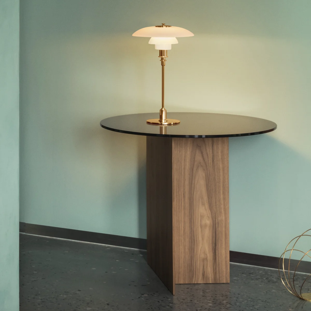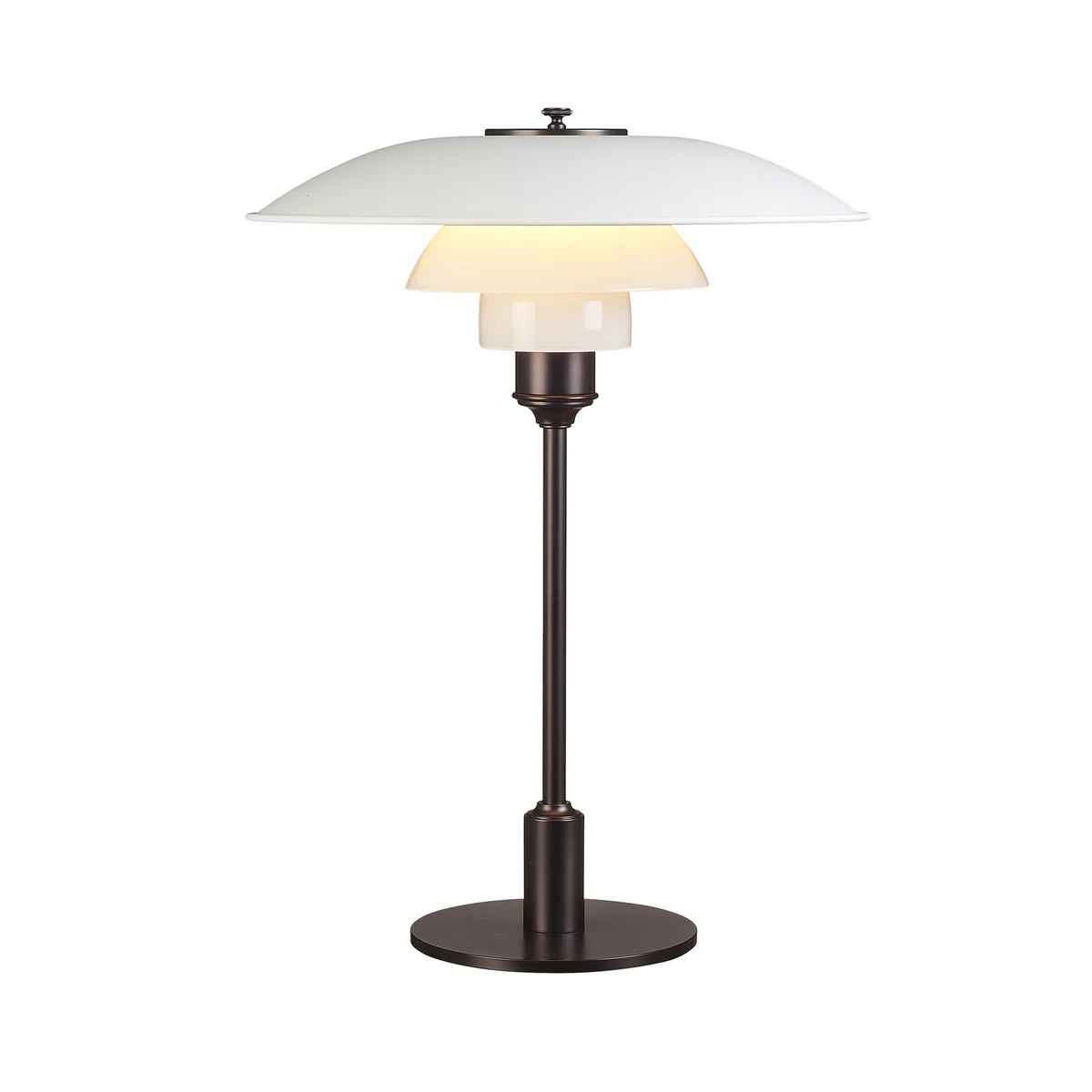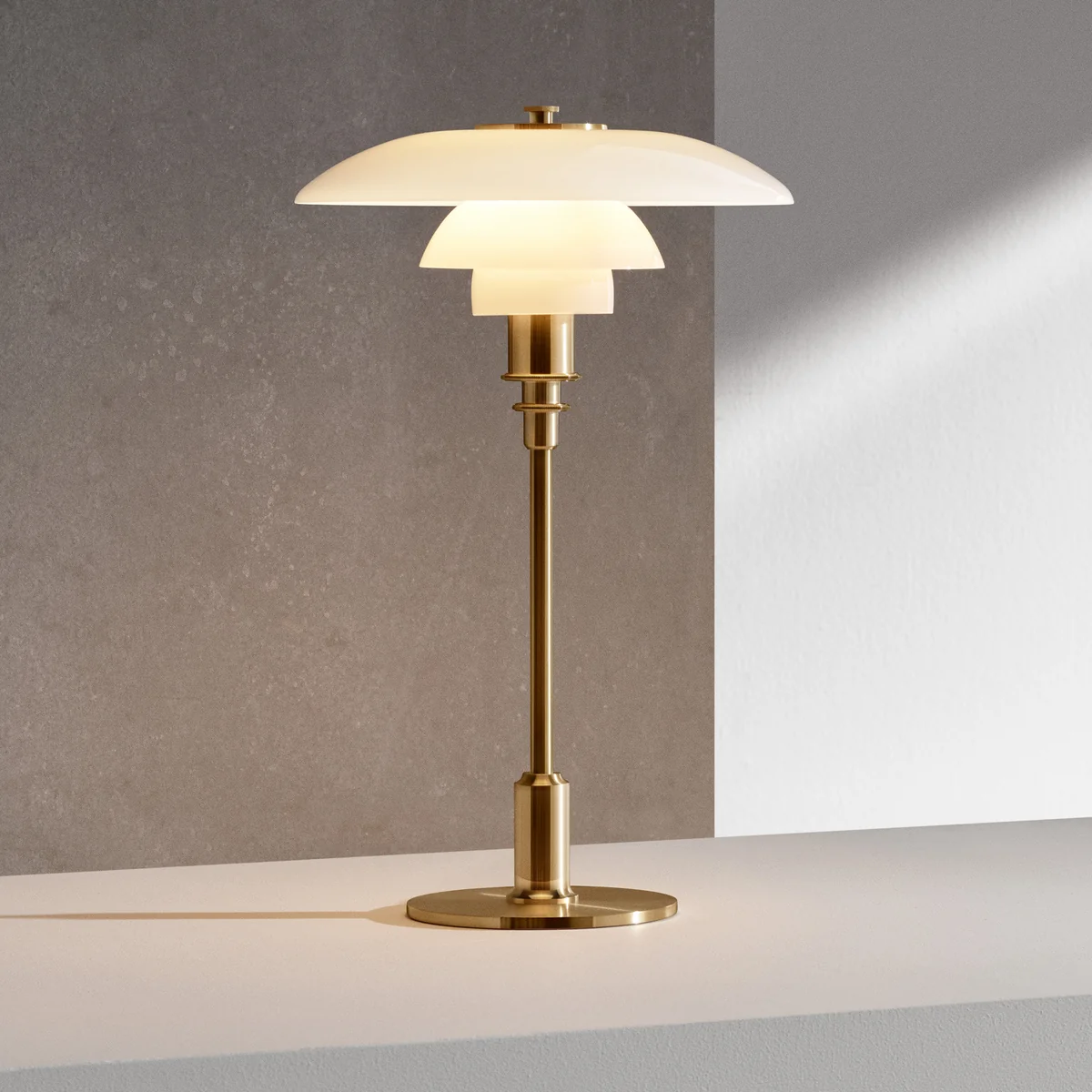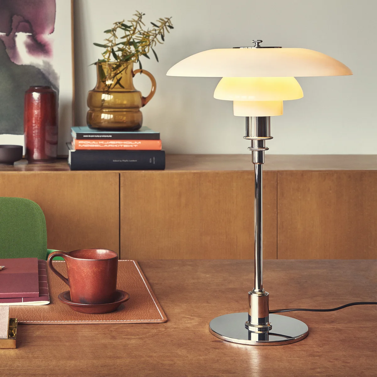 Gestaltet wurde die kleine Tischleuchte PH 3½-2½ ausgehend vom Prinzip eines reflektierenden Dreischirmsystems, das den größten Teil des Lichts nach unten leitet.