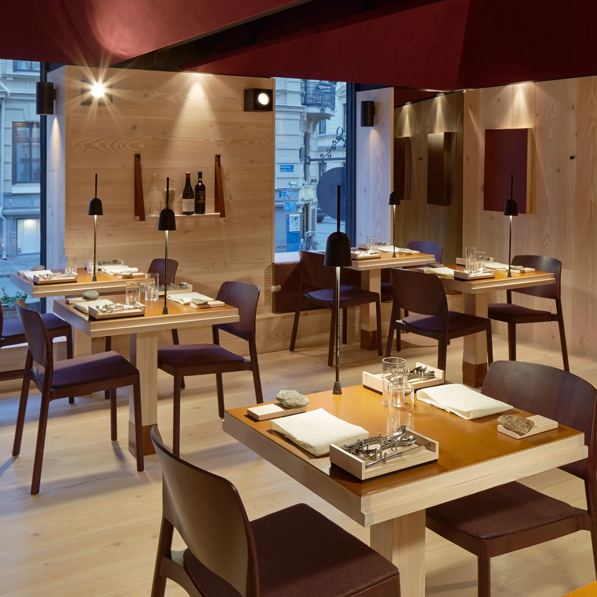 Die Ascent Tischleuchte von Luceplan überzeugt durch ihr absolut minimalistisches Aussehen und überrascht mit seiner flexiblen Funktion. Sie besteht aus einem Fuß sowie einer Stange, auf der ein dimmbarer Lampenschirm, der an der Stange auf- und abgleiten kann, befestigt ist.