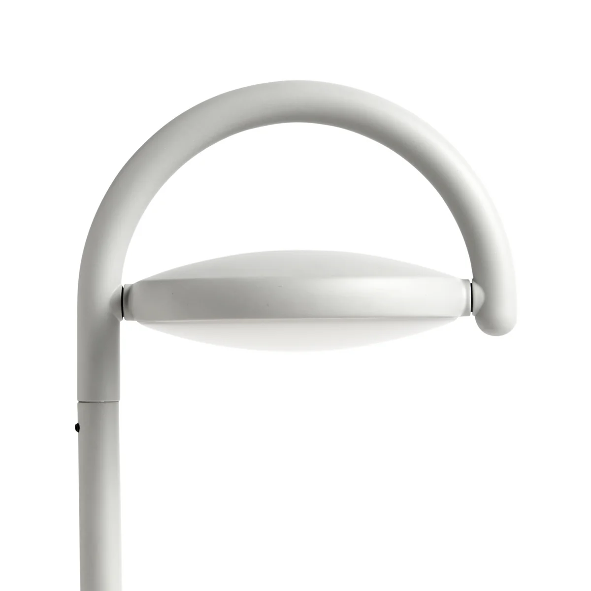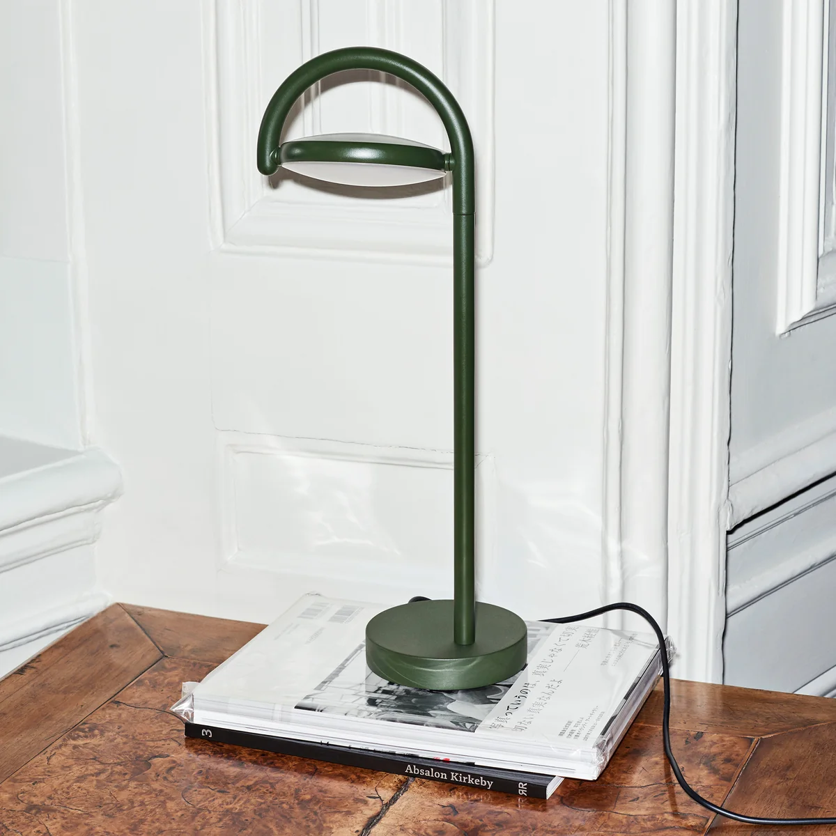 Die Lichtquelle liegt auf einer schwenkbaren Kreisscheibe, die so eingestellt werden kann, dass sowohl indirektes als auch direktes Licht erzeugt wird. Das Gestell der Tischleuchte besteht aus pulverbeschichtetem Aluminiumdruckguss und Stahl. Die Lichtquelle befindet sich hinter einer opalenen Polykarbonatscheibe. Die Leuchte ist in verschiedenen Farben erhältlich und eignet sich für eine Vielzahl von privaten und öffentlichen Räumen.