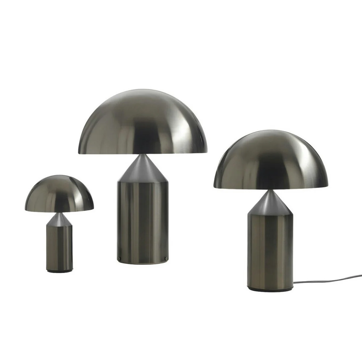 Die Kombination verschiedener geometrischer Formen verleiht Atollo ihr charakteristisches Aussehen und macht sie unverwechselbar. Auf einer kreisförmigen Basis aus Aluminium ruht der zylindrische Körper der Leuchte, die von einem halbkreisförmigen Schirm abgerundet wird.