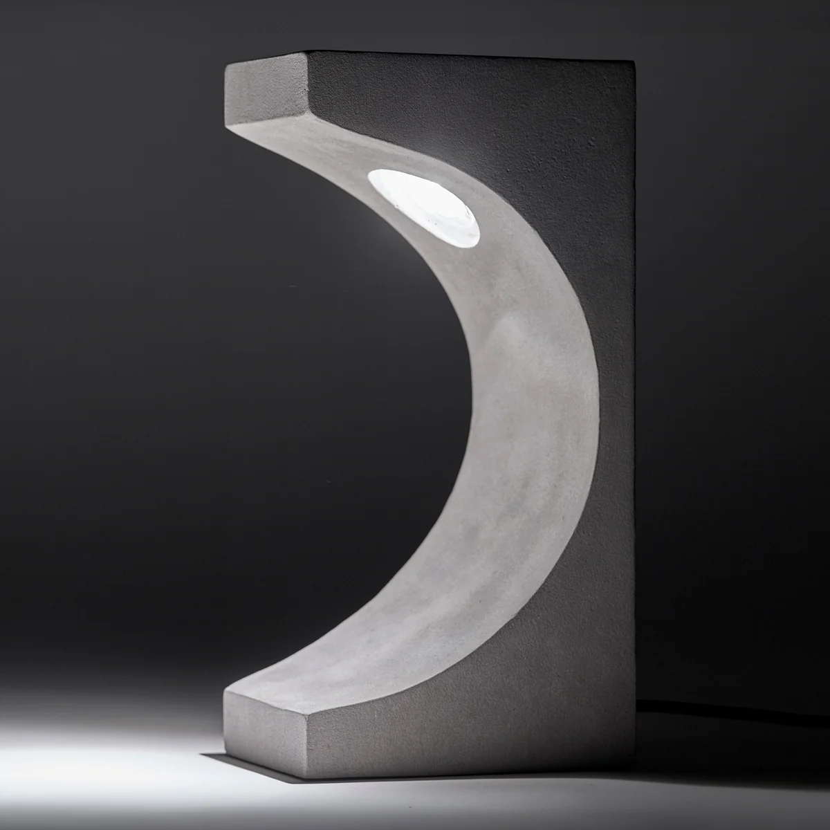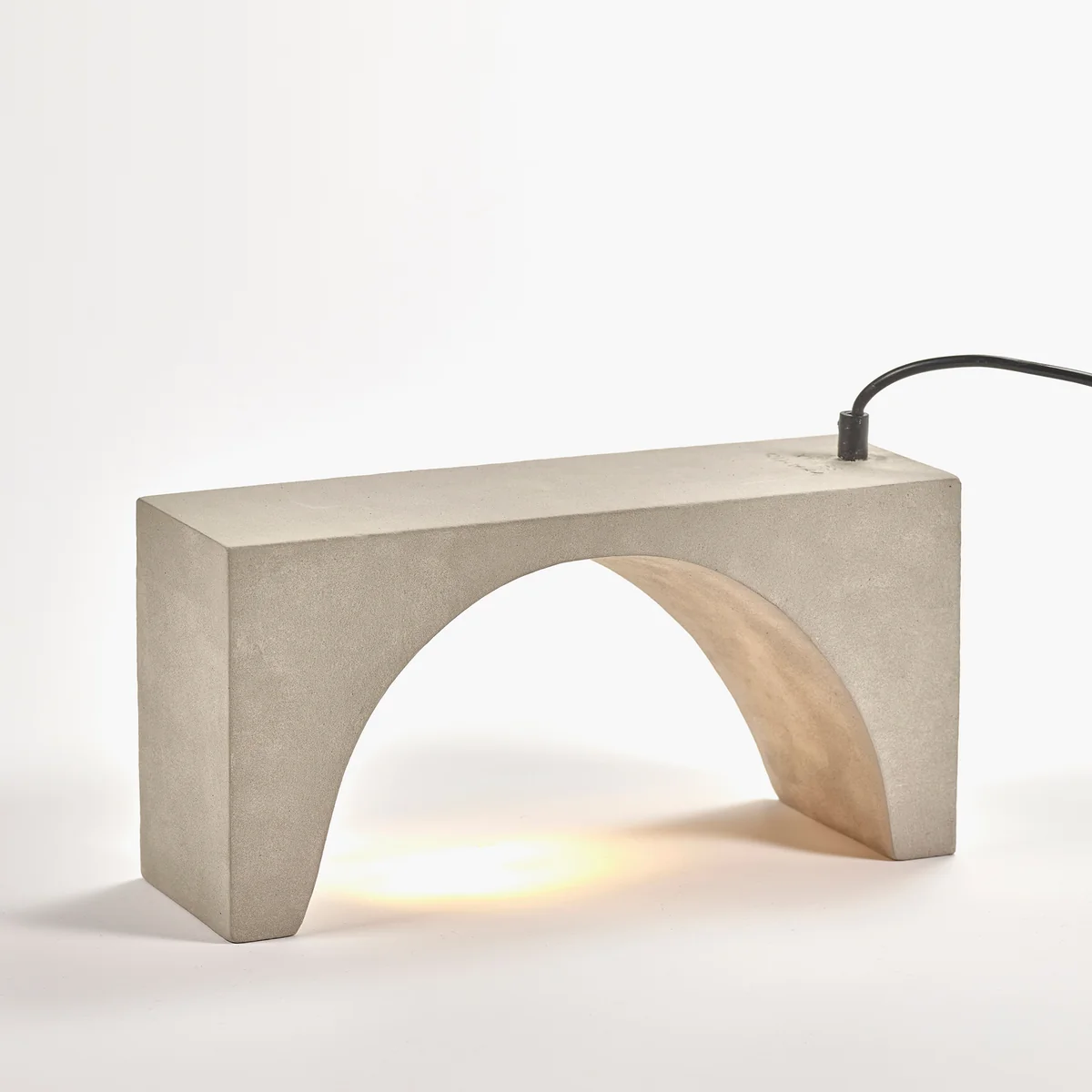 Die Tangent Tischleuchte von Serax, entworfen von Patrick Paris, vereint rohe Ästhetik und skulpturale Eleganz. Gefertigt aus grauem Beton, erinnert die Form der Leuchte an die klaren, kraftvollen Linien eines Brückenbogens. Mit ihrer architektonischen Anmutung fügt sich die Tischleuchte harmonisch in moderne und minimalistische Wohnräume ein.