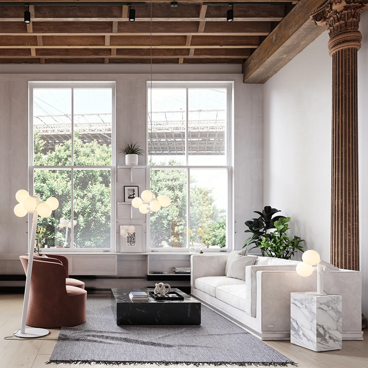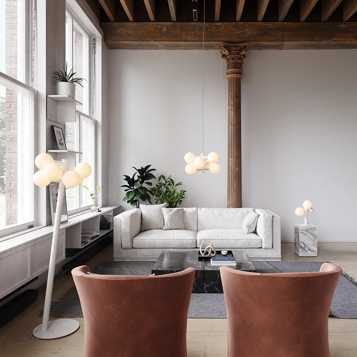 Die Echo Tischleuchte besteht aus drei sich kreuzenden Stahlzylindern mit einem speziellen Drehdimmer am Fuß und ist mit einer gedämpften weißen Pulverbeschichtung versehen. Die Echo Tischleuchte wird mit zwei Sphere IV Glühbirnen geliefert, die eine unübertroffene Dim to Warm Leistung bieten.