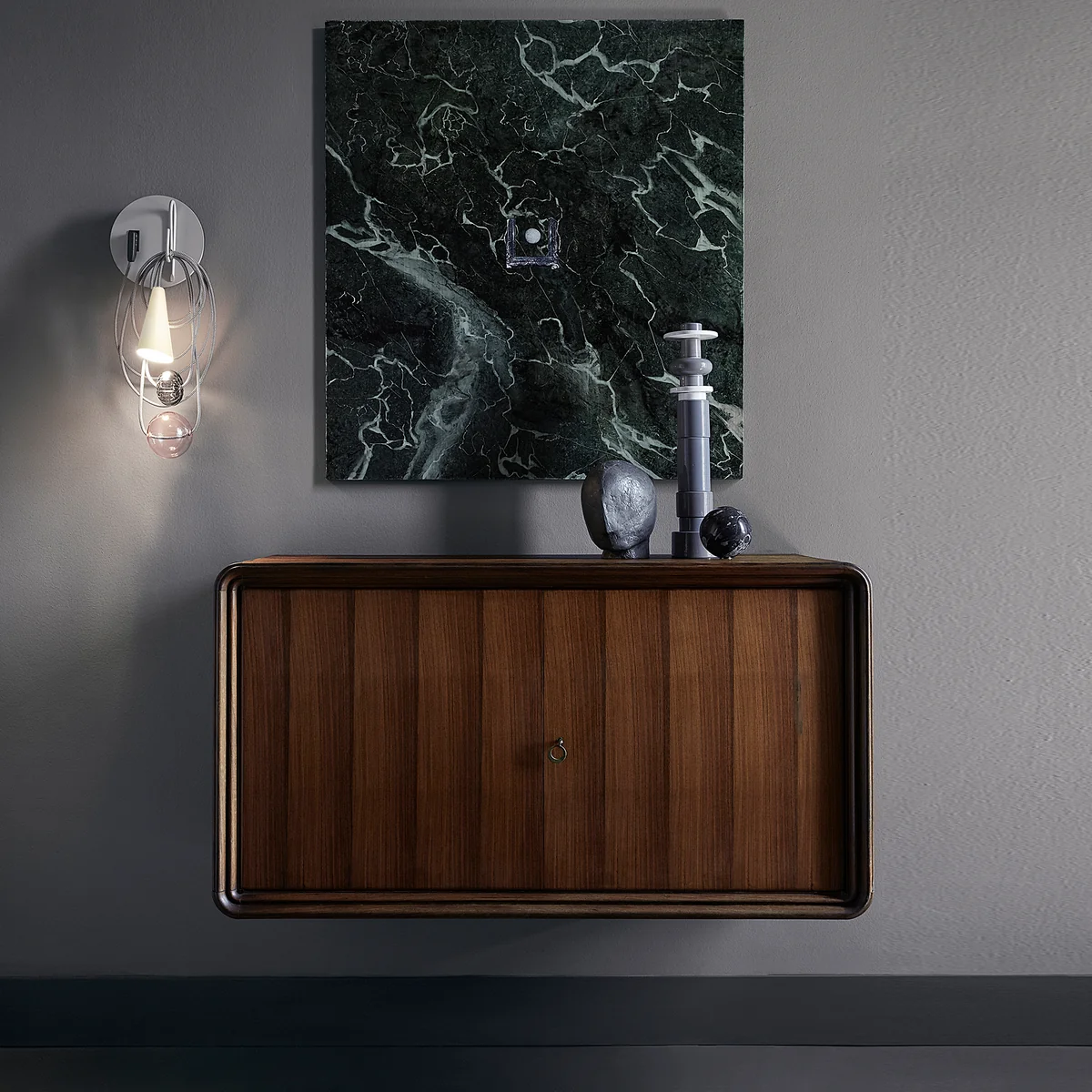 Bei der Filo Wandleuchte handelt es sich um ein verspieltes Leuchtobjekt, das von Andrea Anastasio entworfen wurde. Ziel des Designs war es, die einzelnen Elemente einer Leuchte – Kabel, Lichtquelle und Dekorationselemente – auf ungewöhnliche Weise in Szene zu setzen.