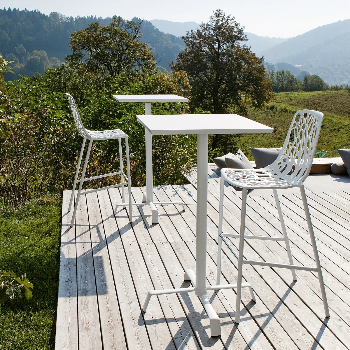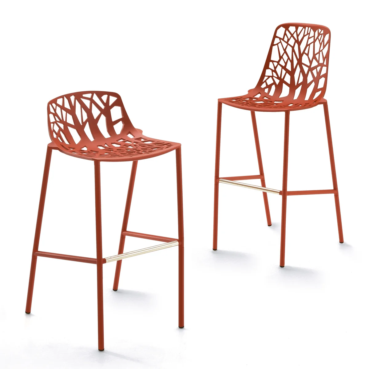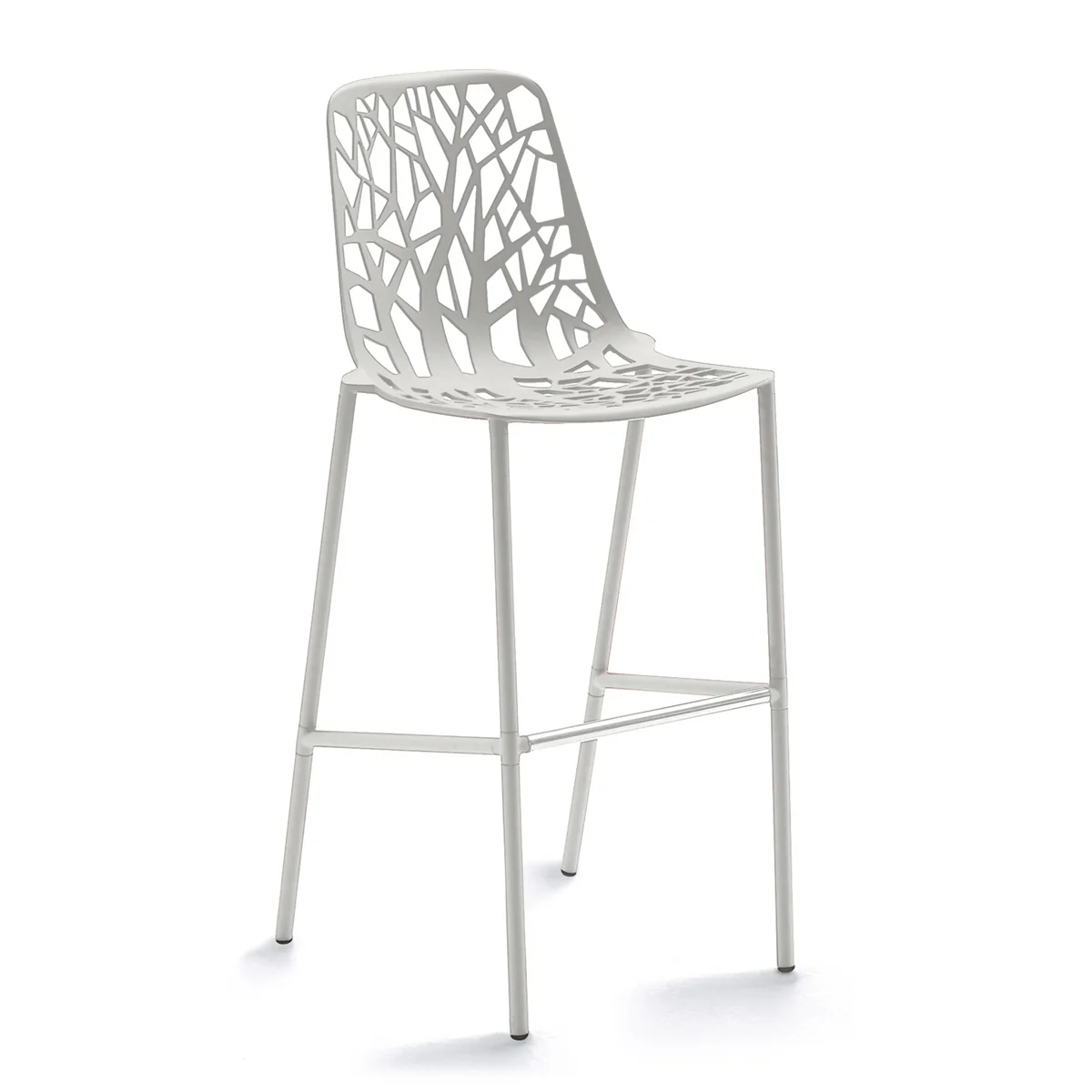 Der Forest Barhocker von Robby & Francesca Cantarutti ist - wie die gesamte Kollektion - inspiriert von den vielfältigen Formen der Natur. Dieser Einfluss spiegelt sich in den ausgefallenen Sitz- und Rückenflächen der Stühle und Hocker wider, die mit einem organischen Dekor begeistern. Der Barhocker - mit hoher Rückenlehne - besteht aus pulverbeschichtetem Aluminium und einer polierten Edelstahl Fußstütze.