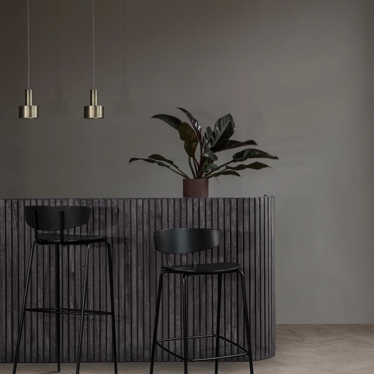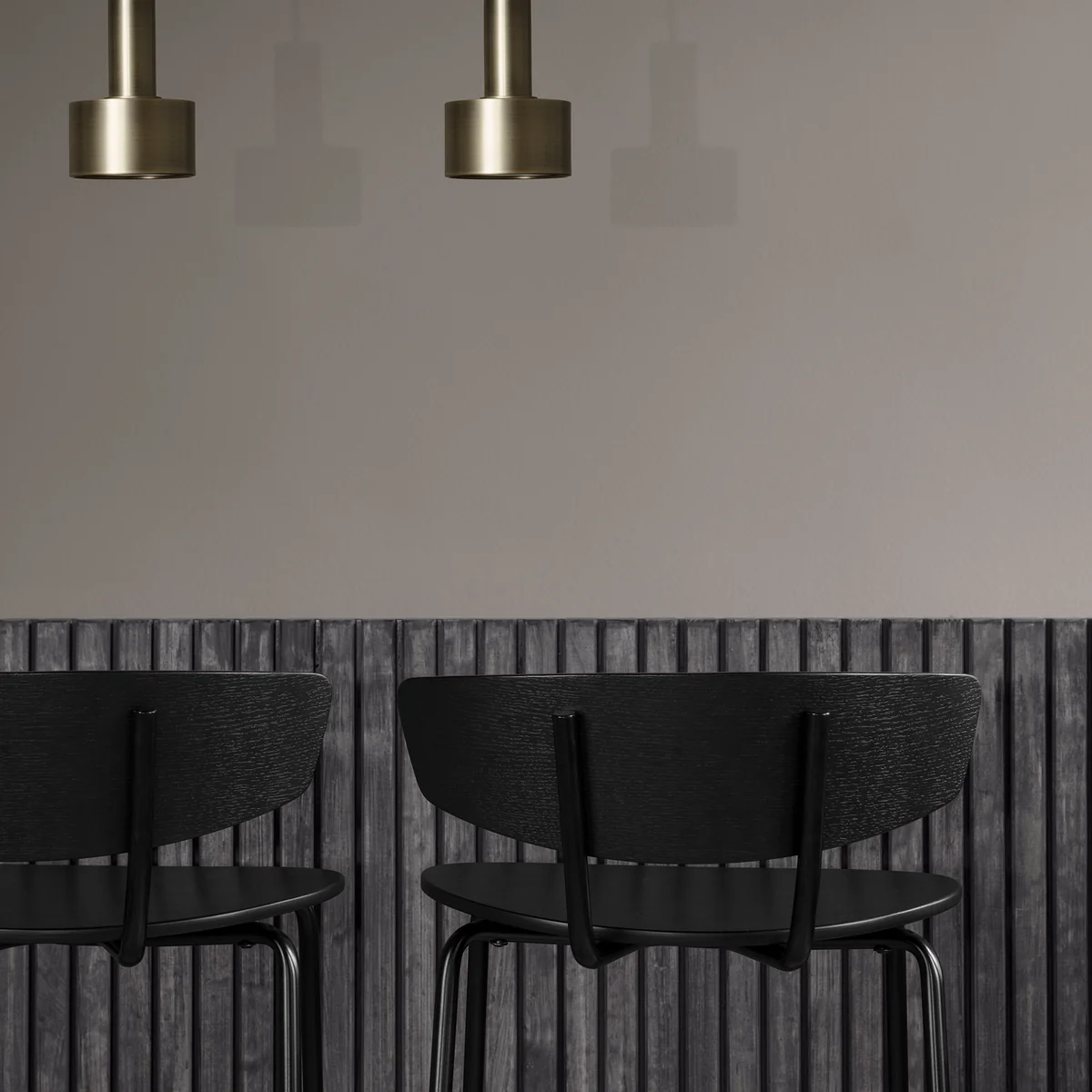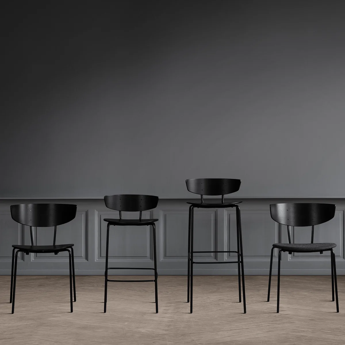 Der Barstuhl wird aus einem Gestell aus pulverbeschichtetem Stahl in Schwarz mit Sitz- und Rückenlehnen aus Eichenfurnier in Schwarz hergestellt. Die niedrige Version mit einer Sitzhöhe von 64 cm eignet sich gut für den privaten Gebrauch in Küchen und an der hauseigenen Bar, während der Stuhl mit einer Sitzhöhe von 76 cm optimal für Hotels oder Bars geeignet ist.