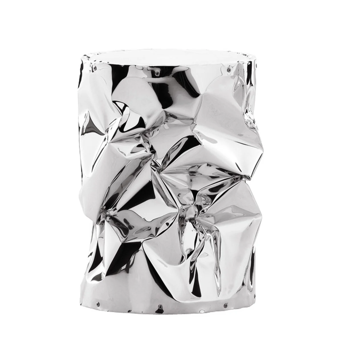 Der Tab.U Beistelltisch löst gleich mehrere Assoziationen aus und erinnert durch seine gefaltete Aluminium-Oberfläche ein wenig an eine zerdrückte Blechdose. Die spiegelnde Oberfläche schafft durch ihre Struktur ein einzigartig spannendes und ungewöhnliches Design – das glänzende, spiegelnde Aluminium verleiht dem Beistelltisch Modernität.
