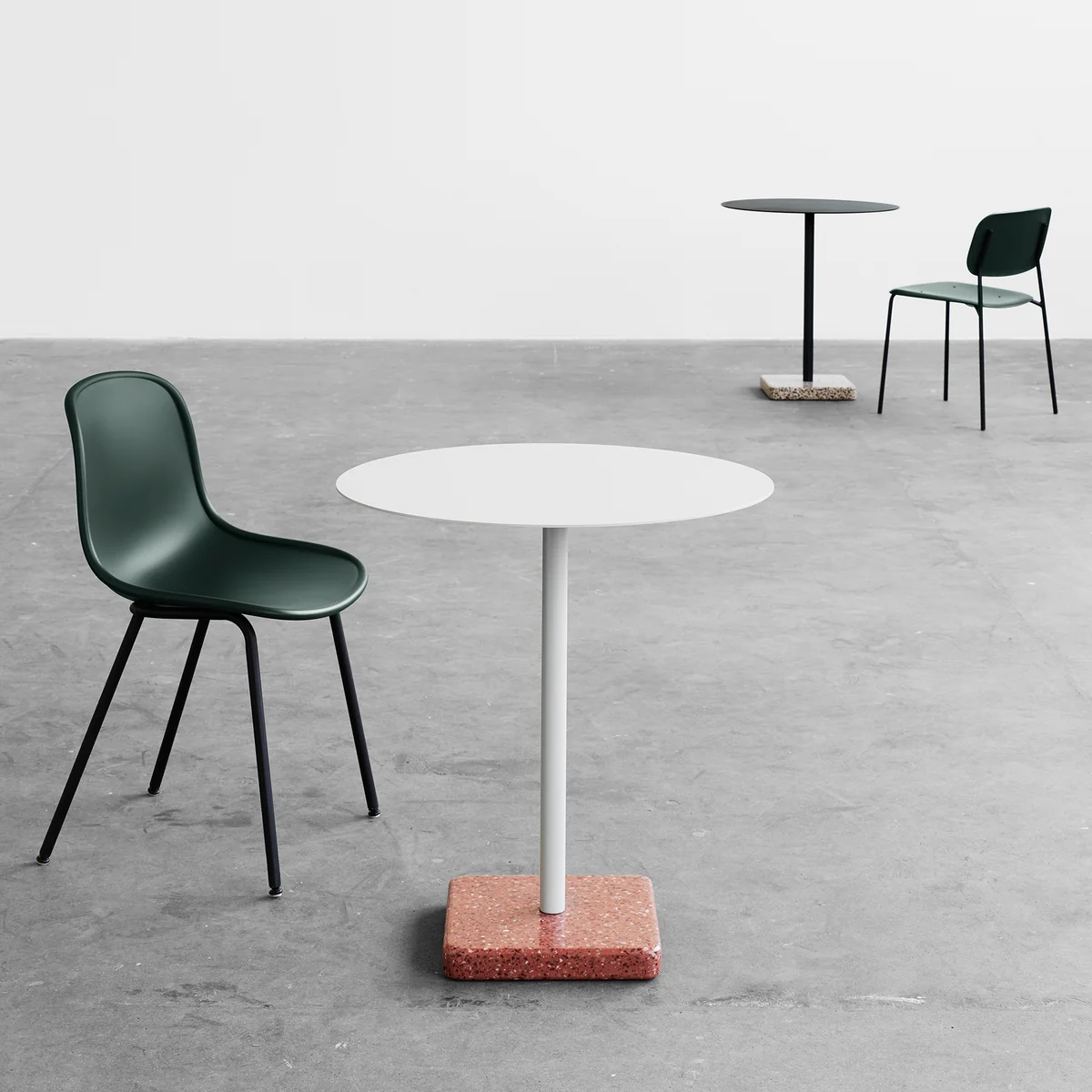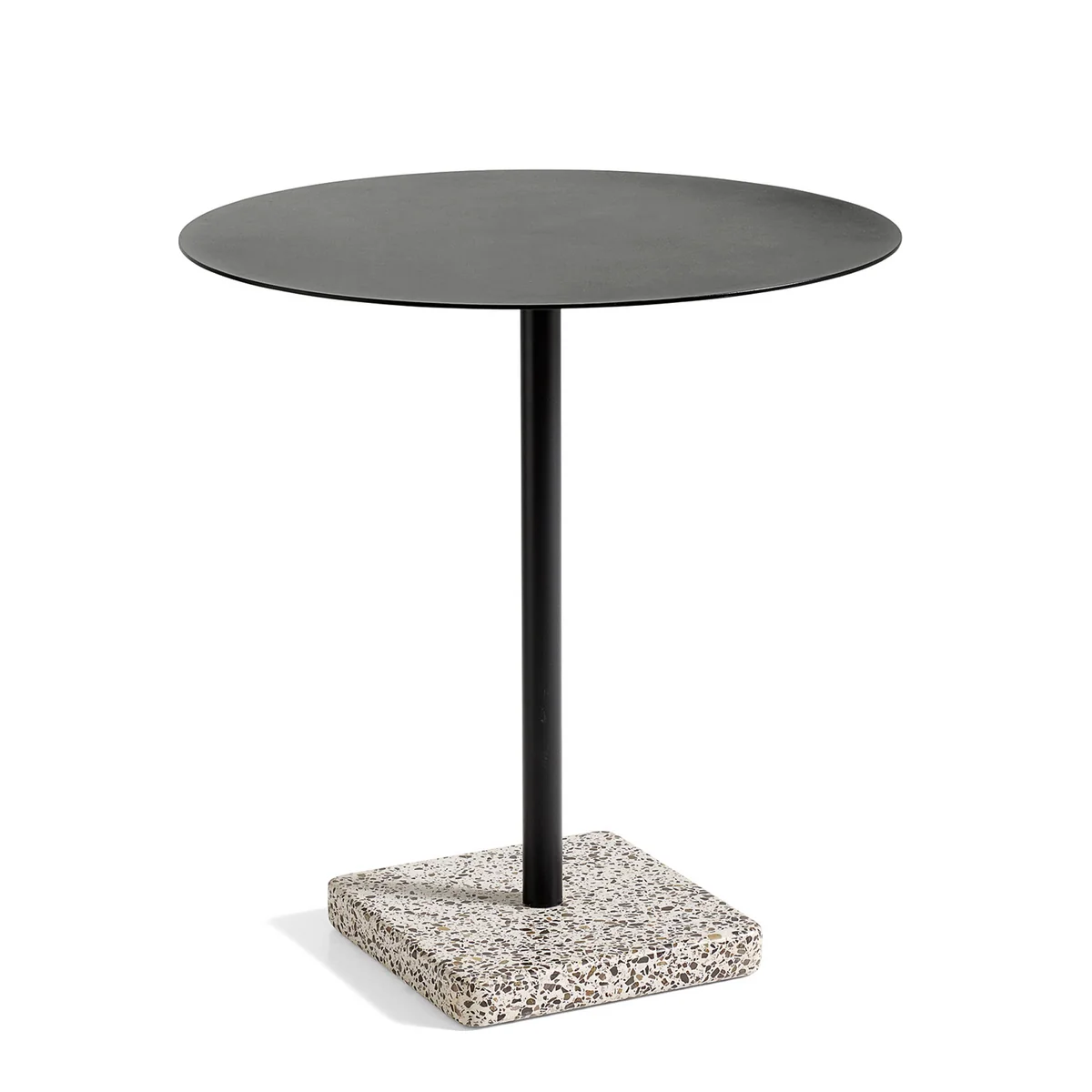 Während die runde Tischplatte aus strapazierfähigem, pulverbeschichtetem Stahl gefertigt wurde, besteht der Sockel aus massivem Terrazzo. Dieser erscheint trotz seiner robusten Eigenschaften bunt und etwas verspielt, sodass ein stilistisch gewollter Bruch zwischen Platte und Sockel entsteht. Zwar hat Terrazzo ähnliche Eigenschaften wie Beton, jedoch hat erstgenanntes Material eine viel eindrucksvollere Oberfläche, die nicht unbemerkt bleibt.