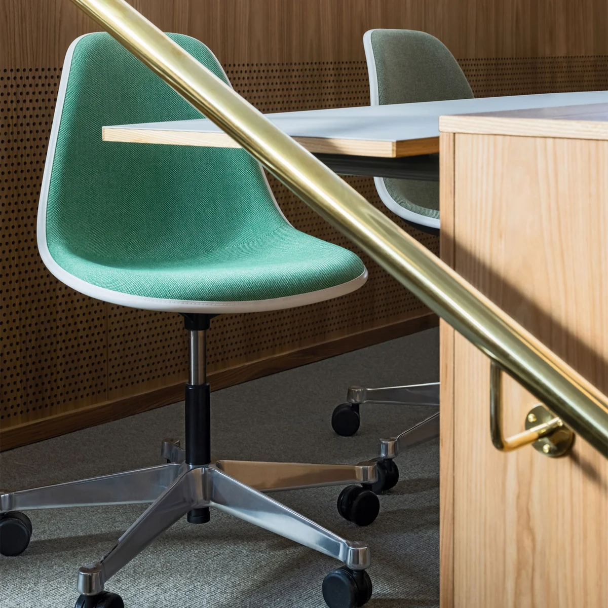 Vitra - Eames Plastic Side Chair PSCC, poliert / weiß, weiche Rollen (Hartboden)