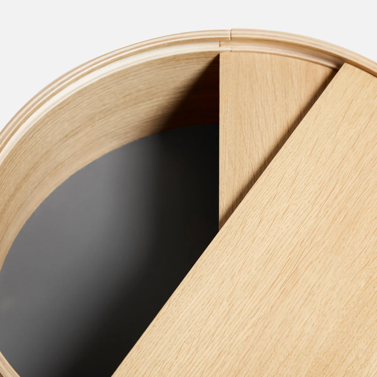 Die Tische werden aus Holz hergestellt. Durch einfaches Drehen einer Hälfte des runden Deckels ist der Look des Tisches jederzeit veränderbar. Die Oberfläche des inneren Stauraums ist mit einem glatten Nanolaminat als Ergänzung zum Holz bedeckt, während die dreibeinige Konstruktion dem geometrisch geformten Design eine spielerische und leichte Note verleiht. Im Innenraum des Tisches lassen sich die Fernbedienung, Bücher und vieles mehr verstauen, während auf der Tischplatte Vasen und andere Dekorationselement einen schönen Platz erhalten.