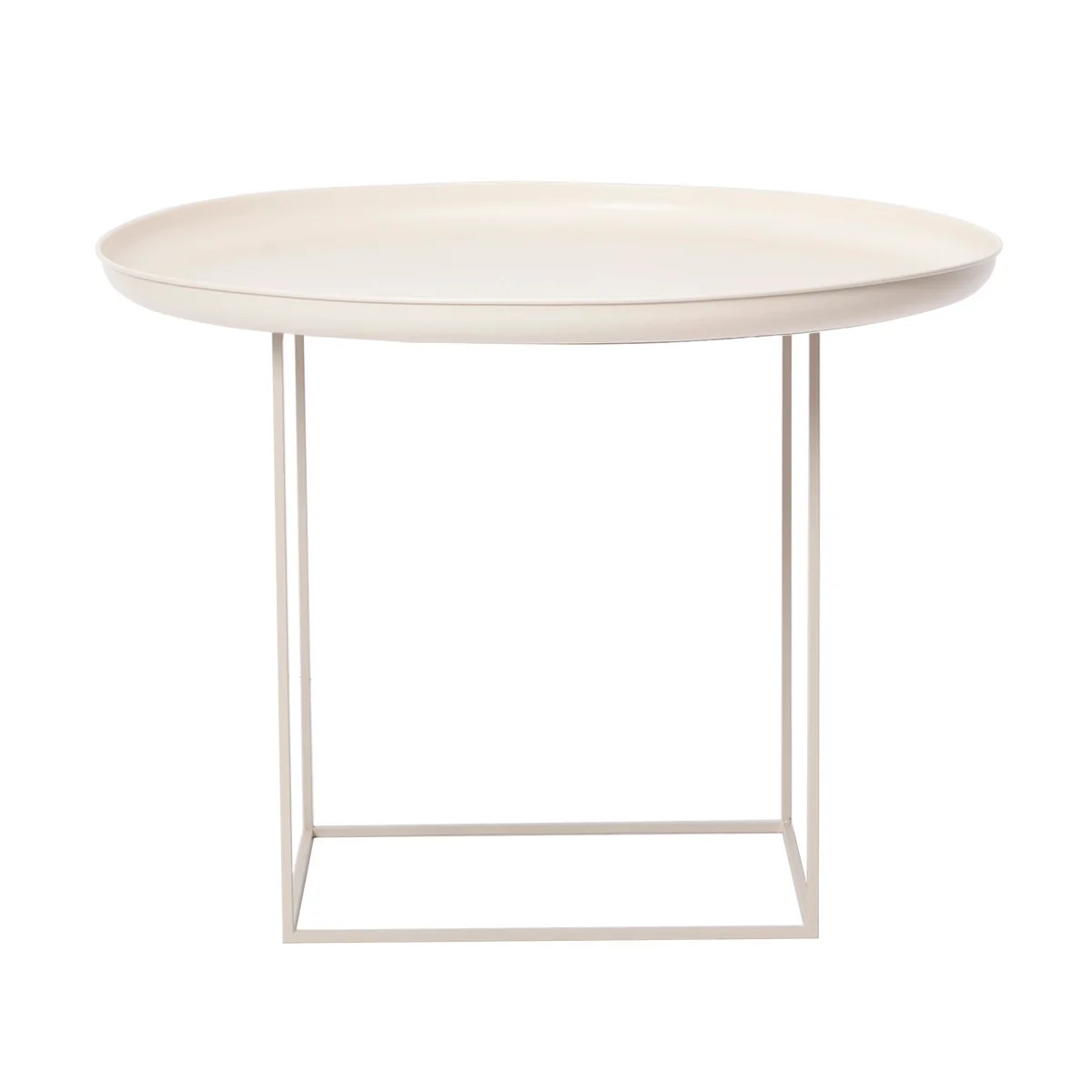 Der Tisch besteht aus einem viereckigen Gestell aus Metall, welches eine runde Tischplatte mit hohen Rändern hält. In verschiedenen Farben erhältlich fügt sich der Couchtisch gut in verschiedenste Wohnräume ein.