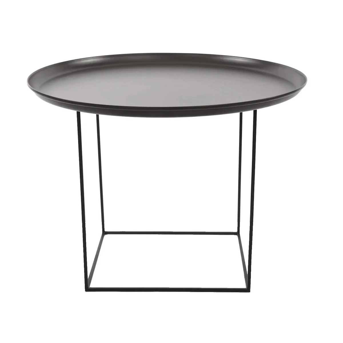 Der Tisch besteht aus einem viereckigen Gestell aus Metall, welches eine runde Tischplatte mit hohen Rändern hält. In verschiedenen Farben erhältlich fügt sich der Couchtisch gut in verschiedenste Wohnräume ein.