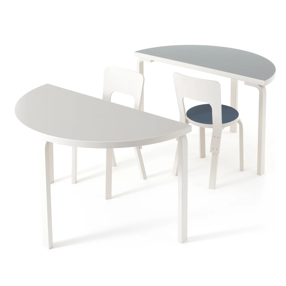Das Besondere an dem Artek-Tisch sind die halbkreisförmige Tischplatte und die L-förmigen Tischbeine, die den sonst so schlichten Tisch zum Hingucker werden lassen. Gleichzeitig ist die Form auch besonders für kleinere Wohnung interessant, in die kein großer Esstisch passen würde. So lässt sich der halbrunde Tisch einfach an eine Wand stellen, wo er Platz für zwei Stühle bietet.