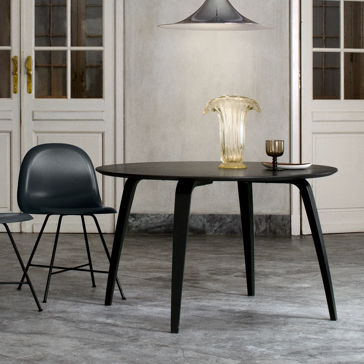 Der Esstisch von Komplot Design für Gubi ist mit seiner runden Tischplatte und den schlanken Beinen besonders vielseitig. Mit einer Tischplatte aus Holz oder Laminat gefertigt begeistert der Tisch mit unterschiedlichen Optiken.