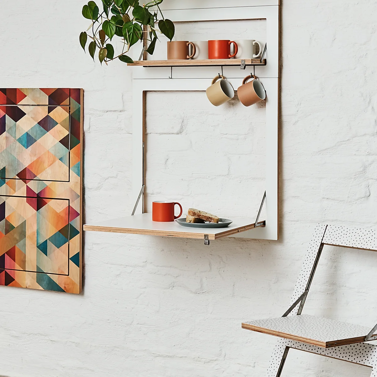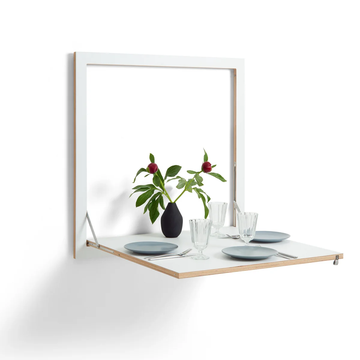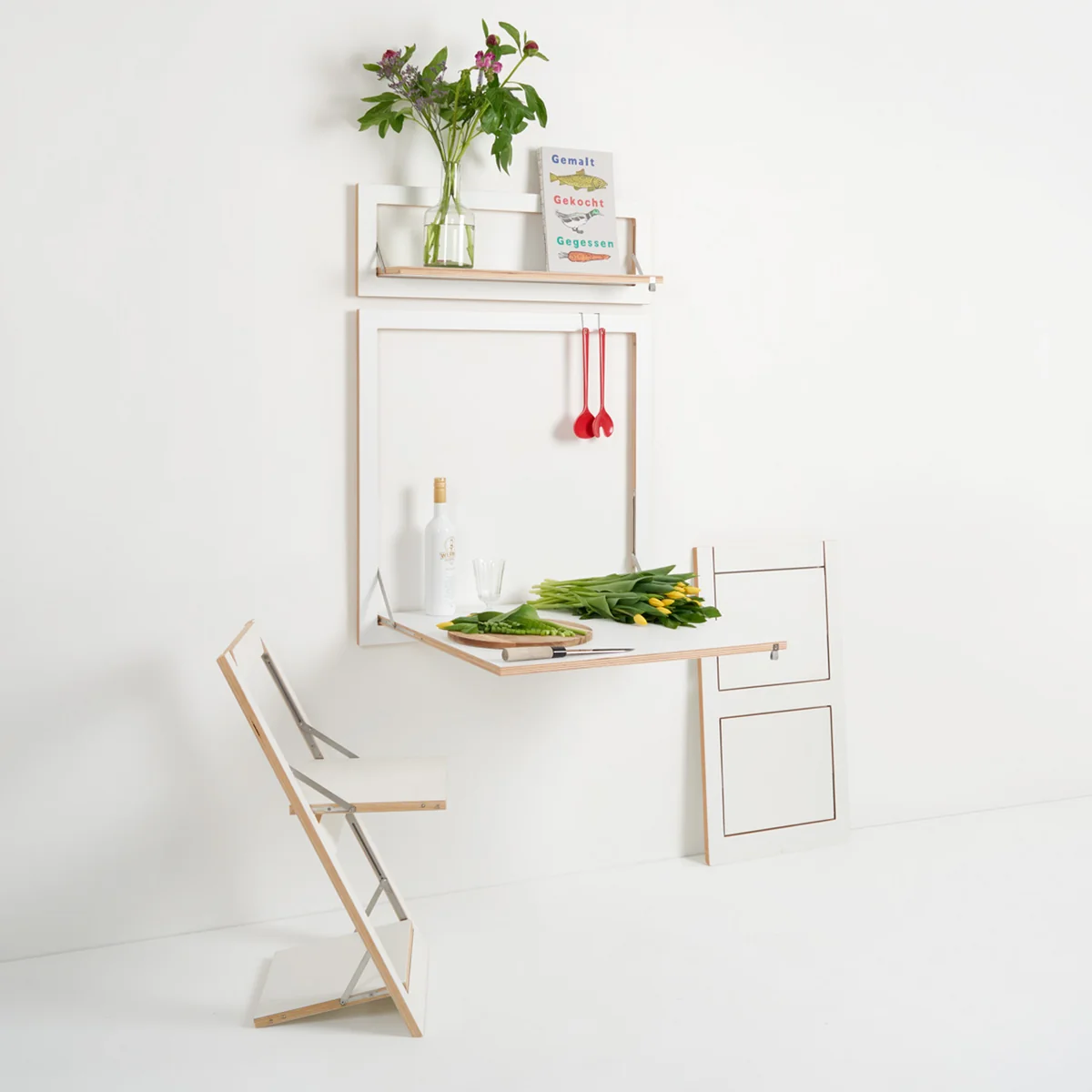 Der Fläpps Kittchen Tisch von Ambivalenz ist der optimale Tisch für kleine Küchen und Räume, in denen für einen normalen Tisch kein Platz vorhanden ist. Der klappbare Wandtisch eignet sich zum Frühstück für zwei, als Arbeitsfläche zum Zerkleinern und Vorbereiten von Obst, Gemüse, Fleisch und Co. und auch als flexibler Schreibtisch.